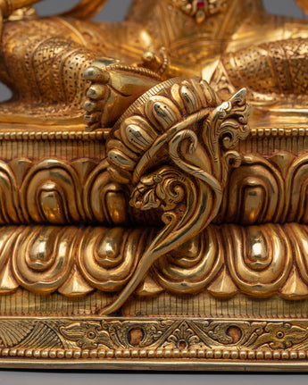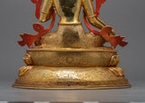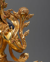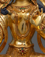 Discover the enchanting sculpting of The Diva Green Tara Statue, which is embellished with sparkling 24K gold gilding and carefully handcrafted from copper. Everything about her, including her flowing robes and soft features, radiates the kindness and defense that Green Tara personifies. This monument, enhanced by acrylic paintings and dazzling gold, exudes grace and tranquility, beckoning worshipers to become lost in its hallowed aura. The Green Tara Statue is a work of art that is intricately detailed and resonates with the divine energy of protection and compassion. She provides comfort and direction to anybody who seeks her blessings.