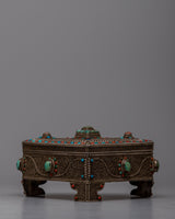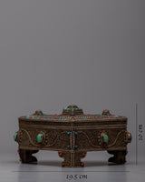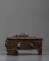 Just picture the refinement and awe this box will impart on your precious area. Thanks to its fine features and tasteful mix of metals and stones, "The Ritual Box" is more than just a piece of storage; it's a work of everlasting beauty with spiritual significance.