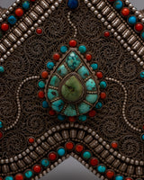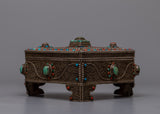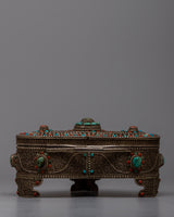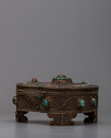 "The Ritual Box," an exquisite work of art with exquisite craftsmanship, will elevate your interior design and spiritual practice. This magnificent box, handcrafted from 2% copper and 98% pure silver, is embellished with genuine turquoise and lapis lazuli stones and artificial coral to create an amazing fusion of natural beauty and artisanal talent.