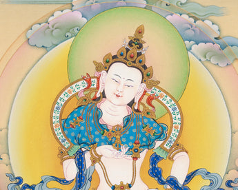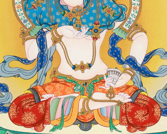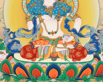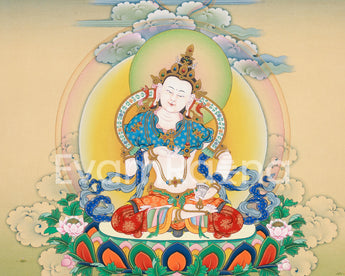The path to inner clarity and spiritual cleansing is illustrated by The Supreme Buddha Vajrasattva, who is revered as the embodiment of wisdom and purification. The tranquil and radiant presence of Vajrasattva is captured with impressive detail and brightness in this quality giclee canvas print. This high-quality replica, which was printed on canvas using the Giclee technique, maintains the original Thangka's elegance and is therefore a timeless item for meditation, spiritual practice, or sacred decor.