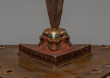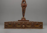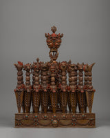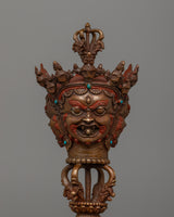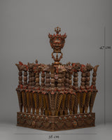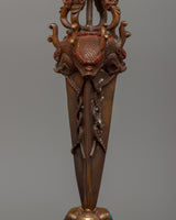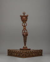 This handcrafted Tantric Phurba set, made of oxidized copper, is an effective Vajrayana Buddhist ritual instrument for protection, energy transformation, and spiritual purification. It is 47 cm tall, 38 cm wide, and 22.24 kg. This hefty and meticulously constructed set is a sacred instrument in Tibetan Buddhism, respected for suppressing negative energies and eliminating spiritual barriers.