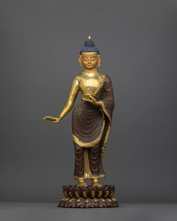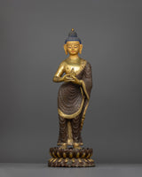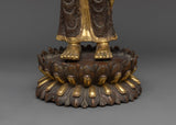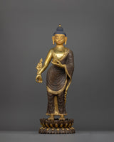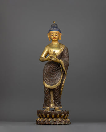 The Amitabha Buddha is standing atop a moon disc lotus seat while carrying an alms bowl in his hand.