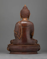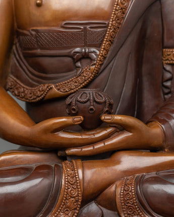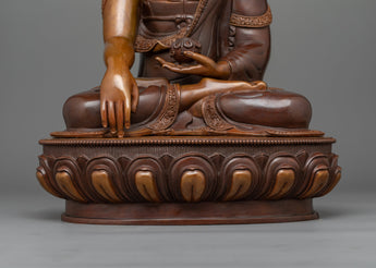 The Three Tathagatas Statue, with its majestic height of 17.9 inches and 12.4-inch base, will take you on a trip towards enlightenment. This statue, which is made of oxidized copper, represents the ageless knowledge and kindness of the three Buddhas: Shakyamuni Buddha, Amitabha Buddha, and Medicine Buddha. From the calm looks to the flowing robes, every figure is carefully carved with minute details, perfectly expressing the spirit of enlightenment. This monument serves as a reminder of the innate capacity for enlightenment within every being, urging them towards the path of liberation and awakening. The harmonic arrangement of the three figures depicts the unification of wisdom, compassion, and healing.