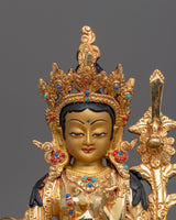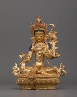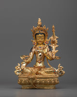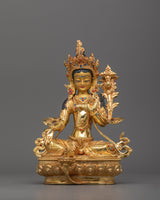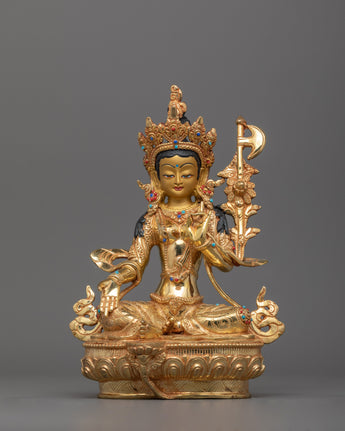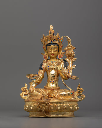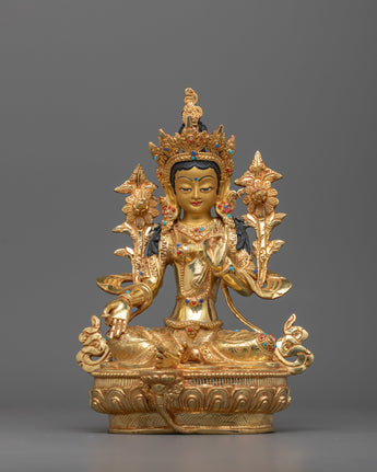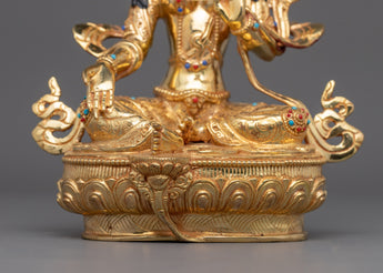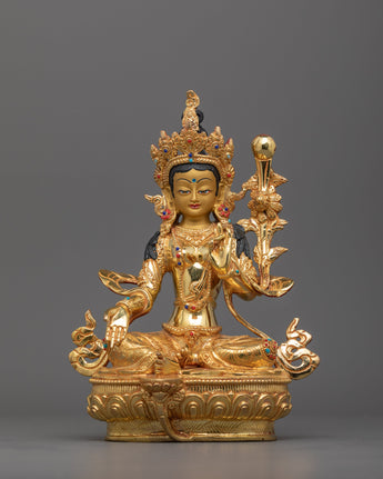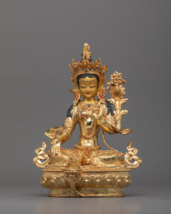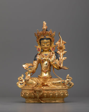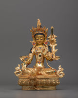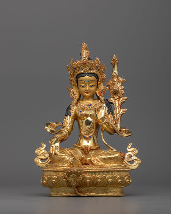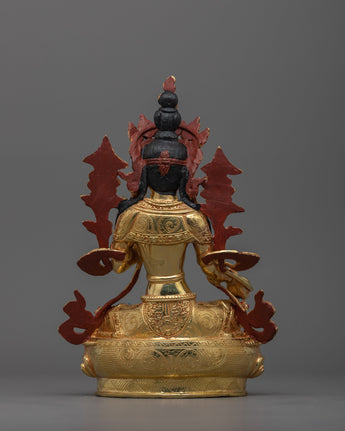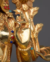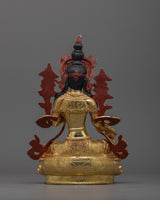 The Sacred 21 Tara Set stands 9.6 inches tall with a base width of 7.3 inches and weighs 41.82 kg, this set is made of copper body, gilded with 24K gold, and gold and acrylic paintings in the face. Each Tara in the set represents different aspects of compassion, protection, and freedom, making this statue set a wonderful place to concentrate for meditation, prayer, and spiritual practice. The lotus pedestal under Taras represents purity and the capacity for spiritual development.
