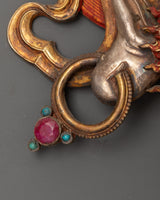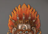 This Tibetan Copper Wall Mask is an influential and intriguing religious art, meticulously created with intricate detail and profound symbolism. This spectacular wall hanging mask, measuring 46cm in height and 36cm in width, is made of copper, plated with gold and pure silver, and hand-painted with brilliant acrylic colors. It exudes the vibrant energy of traditional Tibetan spiritual decor, embellished with coral and turquoise stones. The mask depicts a smiling face with an unsettling, almost mischievous smile, a prominent boar-like nose with tusks, and three wide-open eyes representing increased awareness and divine vision. This mask, framed by flame-like brows, a fiery beard, and wild flame-shaped hair, represents a powerful guardian energy common to Tibetan Buddhist protector deities.