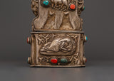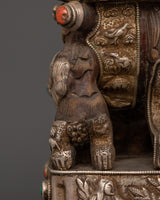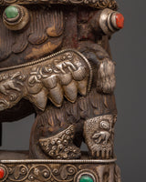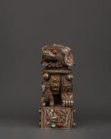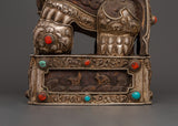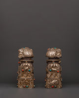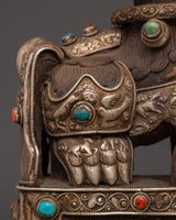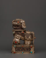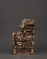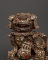 Protect your holy area with the strength and calm of this Handcrafted Tibetan Snow Lion Statue Set. This strong pair of guardians is often placed at doorways or altars. Each statue is 26.5 cm tall and 17 cm broad, with a total weight of 4.674 kg. These lions are painstakingly carved from wood and coated with layers of pure silver, then embellished with authentic turquoise and coral stones. Each is placed by hand to commemorate Himalayan craftsmanship and spiritual tradition.