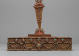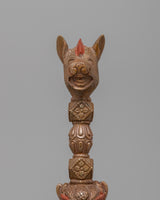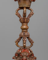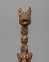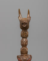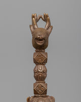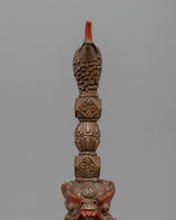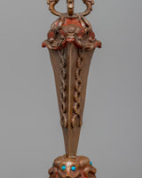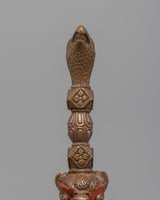 This carefully handmade Tibetan Ritual Phurba Dagger Set is 45 cm in height and 31 cm in breadth, weighs an amazing 11.88 kg, and is made up of oxidized copper with hand-painted details and gorgeous stones. This ritual dagger is an important symbol in Vajrayana Buddhism, representing the transformation of impure energy and the transcendence of the ego. The Phurba is respected for its metaphorical ability to cut through ignorance, attachment, and rejection, which are necessary on the journey to enlightenment.