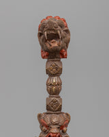 The Phurba's design includes a three-sided edge that signifies the eradication of the three poisons—ignorance, attachment, and aversion—reflecting the transforming path to spiritual understanding. This set features a vajra-like handle that represents indestructibility and compassion, as well as three wrathful deity heads associated with Vajrakilaya, the Phurba's protecting deity. These wrathful faces represent protective forces that guard practitioners from harm and guide them towards spiritual advancement. The addition of a lotus base symbolizes the Phurba's purity and dedication to sacred, transcendent properties.