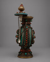 Crafted with great care by hand from pure silver and copper, the Tibetan Silver Snuff Bottle is an astounding 40 cm tall. Exquisite inlays of priceless stones, including lapis lazuli, turquoise, and coral, are shown. These stones each have important symbolic meanings: lapis lazuli represents wisdom, turquoise represents serenity, and coral represents protection. This snuff bottle, which reflects the rich cultural legacy of Tibet, is both practical and aesthetically pleasing. It would make an excellent addition to any collection and a tasteful display piece for your home or place of business.