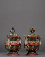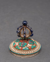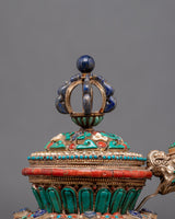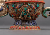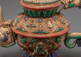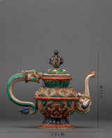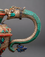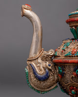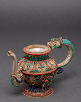 The carved Tibetan Teapot Set is traditionally made with copper and gold and silver plated with original turquoise, lapis lazuli, and coral setting all over the body to give the pot an antique and unique look. It is a unique Tibetan teapot with a dragon on the holder grip and the neck, respectively, where the dragon traditionally represents fortune, authority, growth, luck, and development. The lapis Vajra cap is on the pot.