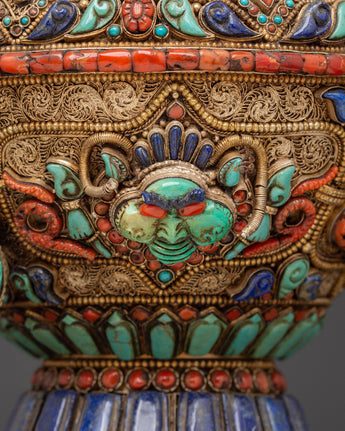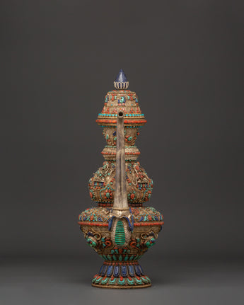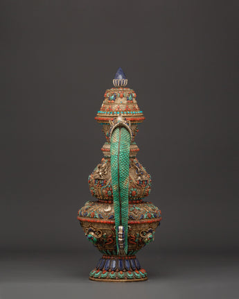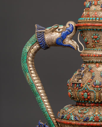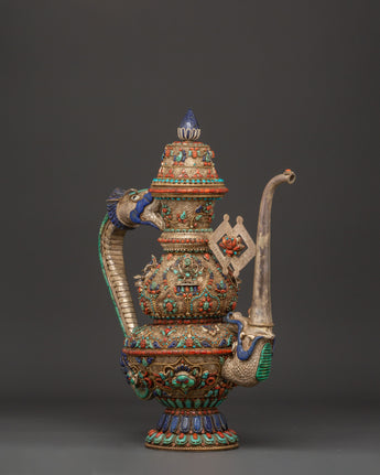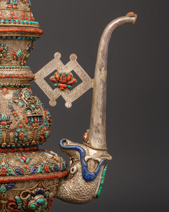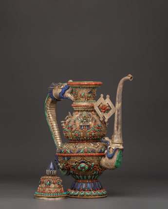 This exquisite Tibetan tea pot with Dragon Handle, made of 92.5% pure silver, reaches 43.5cm tall, 36cm broad, and weighs 3.49kg. The pot is an outstanding representation of Tibetan creativity, with beautiful semi-precious stones (lapis lazuli, turquoise, coral, and conch shell) meticulously placed into the complex filigree silverwork. The handle, designed like a dragon with scales of bright colored stones, green and blue, represents protection and strength. The spout, shaped like a dragon or legendary bird head, is adorned with exquisite engravings and vibrant stones, adding to the pot's spiritual and visual appeal.