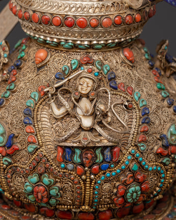 Every inch of the teapot's body is covered in intricate silver filigree designs that form floral themes, holy symbols, and small Manjushri Buddhist deities and wrathful guardian figures carrying ceremonial weapons. These complex embellishments embody the Tibetan Buddhist practice of mixing art and spirituality, transforming this teapot into both a practical vessel and a holy object used in ceremonial offerings. The stones' deep reds, blues, and greens stand out against the silver, symbolizing the natural elements that Tibetan culture values.