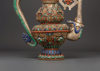 This teapot is ideal for ceremonial usage in Tibetan rites, representing cleanliness, abundance, and spiritual richness. Its elaborate design brings blessings and harmony into holy areas, making it a valuable object for collectors and practitioners. Whether exhibited in a meditation room or used in ceremonial tea offerings, this teapot represents centuries of Himalayan workmanship and religious dedication, making it an amazing spiritual artifact.