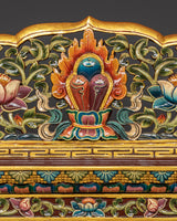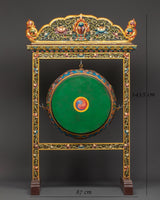 This Traditional Tibetan Drum is a beautiful and spiritual artifact, imbued with profound cultural importance. The drum, measuring 143.5 cm in height and 87 cm in width, is distinguished by a 54 cm diameter Dhangro, rendering it a remarkable enhancement to any spiritual environment. This drum, meticulously manufactured, showcases traditional Tibetan artistry, featuring a striking dragon motif portrayed in striking colors. This drum, utilized in ceremonial rites or as an elegant decorative item, symbolizes the profound cultural legacy of Tibet and imparts a sense of sanctity to your surroundings.