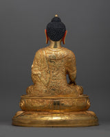 This Tranquil Shakyamuni Buddha statue stands 17.9 inches tall and exudes tranquility and wisdom. This statue, made of copper and gilded in 24K gold, is a strong emblem of enlightenment. The beautiful detailing in the gold and acrylic paints highlights Shakyamuni Buddha's serene look as he sits in deep meditation, embodying the essence of inner serenity and mindfulness.