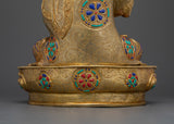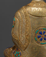 Discover the calm beauty of this carefully crafted Tsongkhapa and His Two Disciples statue, which was made by hand in Patan, Nepal. Crafted from finest copper and adorned with 24K gold, this piece epitomizes the illustrious legacy of Nepalese metalworking. The image of the esteemed Tibetan Buddhist monk Tsongkhapa and his two students symbolizes both his profound understanding and the lessons he imparted. Every figure has a serene face and fine details that accentuate our artists' extraordinary skill. The statue's heavenly beauty and spiritual importance are further enhanced by the vivid acrylic and gold paintwork and the hand-carved gemstones.