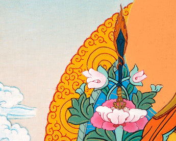 The Kathmandu Valley artist has traditionally hand-painted this exquisite thangka of Tsongkhapa, Tibetan Buddhis Master in Karma Gadri Style. He is seated atop a moon disc lotus seat with a serene expression. The orange halo is illuminating his face while the blue nimbus encircled with a pure gold color is engulfing him. He is holding the Lotus (utpala) in both hands-on which. The wisdom book on the left and the burning sword on the right are placed on top of the Lotus.