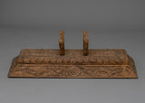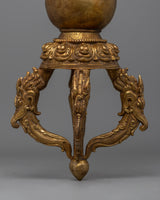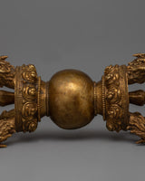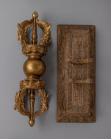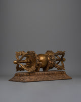 The vajra comes with a beautifully carved wooden stand that was deliberately created to complement the piece's overall beauty and presence. The wood's natural warmth and texture contrast beautifully with the dazzling gold of the vajra, resulting in a harmonic blend of materials. The stand not only serves a functional purpose but also improves the overall visual appeal, transforming this sacred object into a work of high art and craftsmanship. The vajra and its wooden stand make a striking combination, perfect for altars, meditation rooms, or as a discussion starter decorative piece.