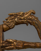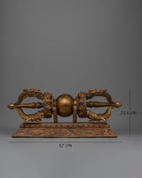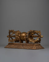 This Vajra Buddhist with Stand is a beautiful handcrafted sculpture that represents spiritual strength and enlightenment. This vajra, made of handmade copper and delicately gold-plated, represents the indestructible nature of wisdom and compassion in Tibetan Buddhism. With an amazing breadth of 57 cm, this artwork attracts attention and exudes a powerful aura of resilience and holy energy, making it an ideal centerpiece for any sacred or ornamental setting.