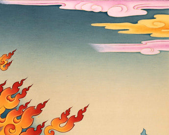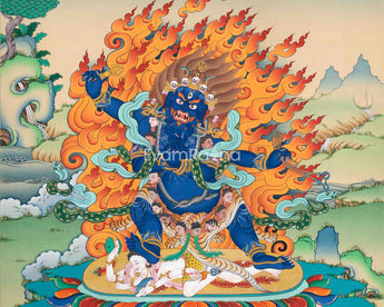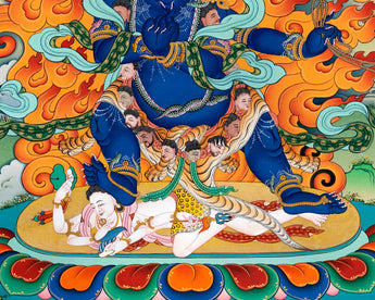 "Vajrapani Thangka Print's Fearless Aura" captures the awe-inspiring essence of Vajrapani, the Thunderbolt-Bearing Protector, with unparalleled artistry. This masterpiece beckons you into a world of unwavering courage and spiritual strength. Vajrapani's formidable presence, meticulously depicted in intricate detail, radiates an aura of fearlessness and might, offering protection and empowerment to all who engage with it. The Thangka acts as a conduit to Vajrapani's indomitable energy, reminding us of our own inner resilience and potential for overcoming life's challenges. As you contemplate this artwork, you'll feel an infusion of spiritual vigor, guiding you towards a profound sense of inner strength and a fearless outlook on life. "Vajrapani Thangka Print's Fearless Aura" is more than just art; it's an embodiment of unwavering protection, an enduring source of inspiration, and a reflection of Vajrapani's timeless teachings.