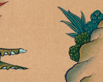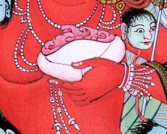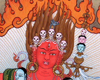 Vajravarahi is placed at the center of the thangka. She is fully colored red-blooded. She wears a necklace of skulls representing purification of speech. Her left hand holds a skull cup and flays the knife in another hand.