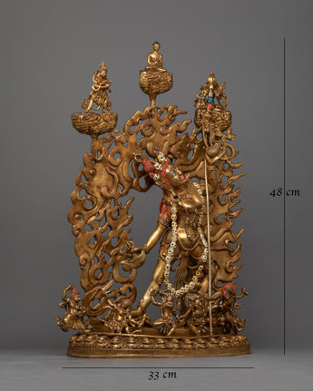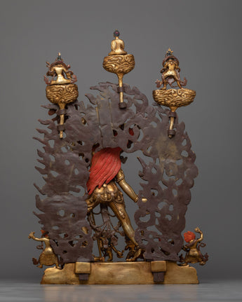 This statue, which has an elaborate 24K gold gilding and a copper body, is given an antique polish to highlight the fine features of Vajrayogini's dynamic attitude and fierce look. The vividness and richness of her imagery, including her symbolic weaponry and flowing attire, are highlighted by the acrylic and gold paints. Its 8.25 kg weight gives it a powerful presence that makes it perfect for enlivening the hallowed areas of yoga studios, meditation institutes, or houses devoted to spiritual development.