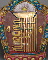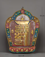 The central section of the hanging wall contains calligraphy-style inscriptions or symbolic characters that have spiritual significance in Tibetan Buddhism. These markings, which are carefully etched or painted, add to the wall hanging's status as a spiritual artifact. They are more than just decorative; they serve as a visual expression of more profound religious teachings, conveying messages of peace, wisdom, and enlightenment. This connection to Tibetan Buddhist philosophy is central to the piece, making it a valuable addition to any setting.