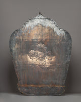 This Tibetan Wall-Hanging Buddhist shrine is a beautifully designed spiritual artwork with a copper body plated in gold and painted in acrylic colors. It stands 80 cm tall and 59.5 cm wide, making it a standout decor piece. The wall hanging weighs 11.10 kg, giving it a commanding presence that draws attention while maintaining a serene, spiritual atmosphere. The gold-plated areas give the piece an elegant, sacred touch, representing the richness and depth of Tibetan Buddhist traditions.