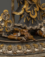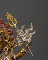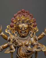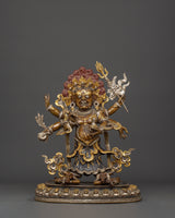 This statue is expertly carved from oxidized copper with silver plating, and every detail showcases authentic Himalayan craftsmanship. The swirling flames behind him indicate transformation and spiritual purification, while the deity's numerous arms carry ceremonial artifacts that represent his divine powers. The skull crown, rich jewelry, and strong demeanor emphasize his role as both a spiritual guardian and a remover of obstacles. This statue is perfect for use in home altars, temples, or as a significant piece of meditation decor with cultural and philosophical meaning.