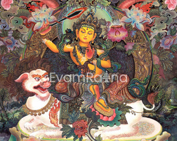 The Bodhisattva of Wisdom, Manjushri, is gracefully brought to life in The Manjushri Thangka Print, a visual masterpiece that serves as a portal to transcendent knowledge. Capturing the essence of divine intellect, this print depicts Manjushri wielding the sword of wisdom, poised to cut through the veil of ignorance. The intricate details and vibrant colors on the cotton canvas breathe life into the embodiment of wisdom, seated on a lotus, symbolizing purity. This thangka print is not merely an artistic rendition but a profound expression of spiritual insight and illumination. Whether adorning an altar or meditation space, The Manjushri Thangka Print invites seekers to cultivate wisdom, clarity, and enlightened understanding on their spiritual journey, resonating with the timeless teachings of the Bodhisattva of Wisdom.