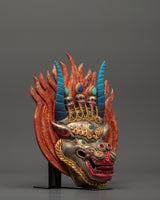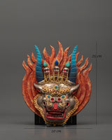 In Tibetan Buddhism, Yamantaka is revered as the remover of death and ignorance, guiding practitioners to enlightenment and inner change. His angry countenance, fiery aura, and magnificent crown, decorated with skulls, represent victory over evil forces and attachments. The exquisite workmanship on this handcrafted Yamantaka mask showcases both its spiritual significance and exceptional craftsmanship, making it a highly prized spiritual item among Vajrayana practitioners.