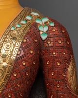This statue's superb construction from a copper body and 24K gold gilding perfectly complement the vivid acrylic paintings in gold and yellow that accentuate the Buddha's contented countenance and the dexterous detailing of his robes. With its massive presence and weight of 24.81 kg, it is perfect for enlarging the sacred area of larger meditation centers or temples, or for use as the focal point of large home sanctuaries, This Shakyamuni Buddha Statue in yellow should be displayed prominently to promote peace and spiritual awakening.