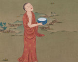 The painting has been drawn based on one of the events mentioned in Zen tradition. It is shown Aryadeva is coming to see Nagarjuna so he asks his attendant to prepare a bowl full of water in order to test the knowledge of Aryadeva.