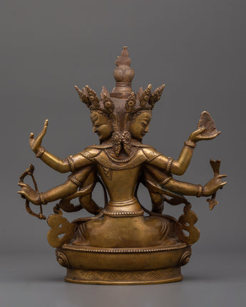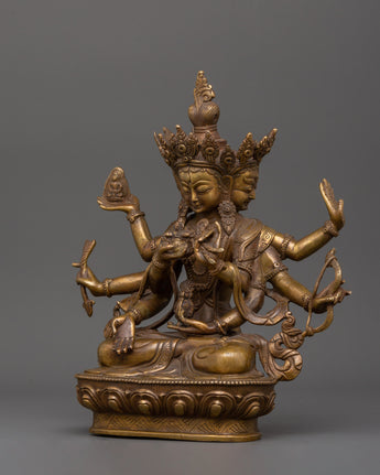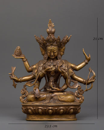 This antique copper statue of Namgyalma, a profound representation of longevity and spiritual purification, can help you invoke timeless wisdom and supernatural protection. According to Tibetan Buddhism, Namgyalma (Ushnisha Vijaya), a goddess of long life with three peaceful faces and eight elegantly extending arms, is capable of cleansing even the most formidable karmic impediments. Expertly fashioned from copper, this statue stands 21 cm tall and 23.5 cm wide. Its rich antique finish adds to its spiritual beauty and historical significance.