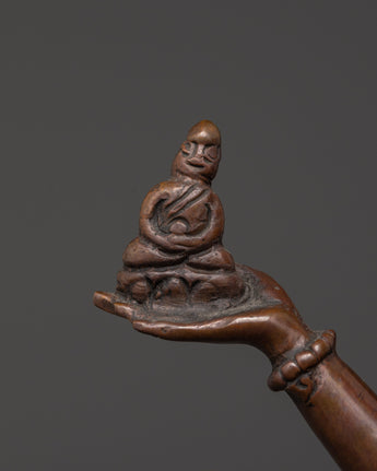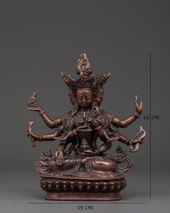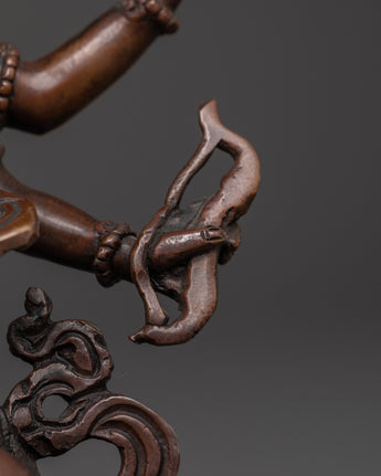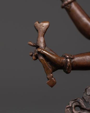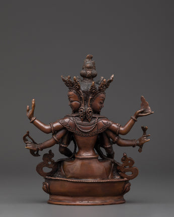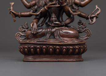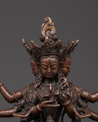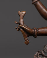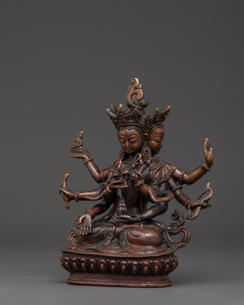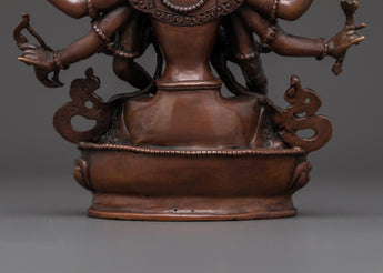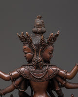 The exquisite features of Namgyalma's three faces and eight arms, each representing a distinct facet of heavenly strength and compassion, are emphasized by the dark, deep tones of the oxidized copper body. Traditionally used in ceremonies, this mystical sculpture is believed to aid in soul cleansing and the removal of obstacles from one's spiritual journey. This statue gives any space depth and purpose, regardless of whether you are a spiritual seeker, collector, or practitioner. This exquisitely created copper-oxidized Namgyalma is ideal for ceremonial use, spiritual protection, or considerate giving.