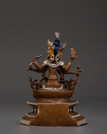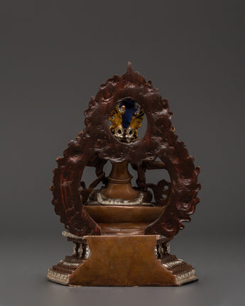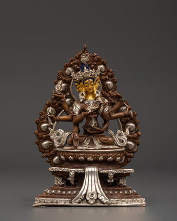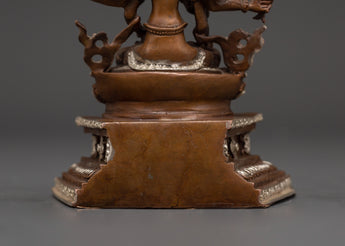 Namgyalma is revered for her ability to protect against negative forces and promote longevity, spiritual health, and wisdom. The silver plating enhances the statue’s divine presence, symbolizing purity and spiritual enlightenment. The oxidized copper body adds a grounded, earthy energy to the figure, representing the connection between the material and spiritual worlds.