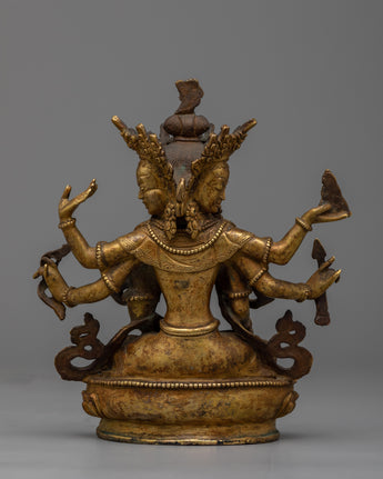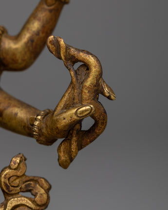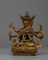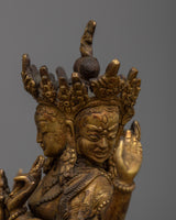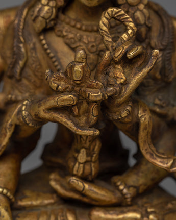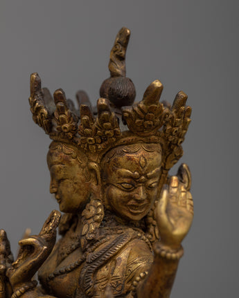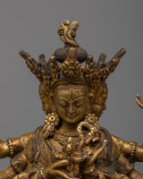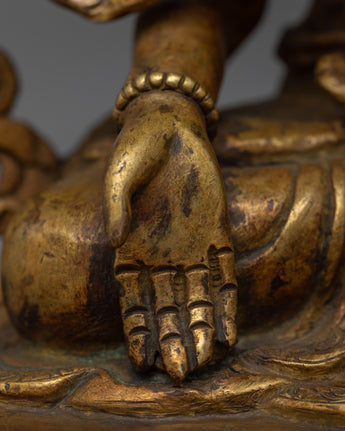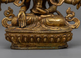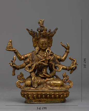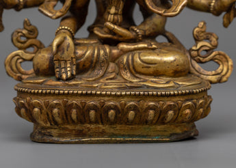 The Namgyalma Statue is expertly handcrafted on a copper body, demonstrating the artisans' dedication and craftsmanship. The statue has a shining 24k gold plating that adds a touch of elegance and grandeur to its appearance. An antique finish is applied to the statue to enhance its beauty and bring out the intricate details, lending it a sense of antiquity and reverence. Namgyalma, the deity of longevity and purification, is shown in a serene and graceful posture, exuding peace and tranquillity. This magnificent statue serves as a reminder of Namgyalma's divine qualities and teachings, inspiring devotion and spiritual growth.