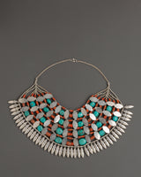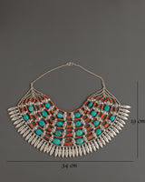 Crafted from white metal and silver-plated for a vintage appearance, this ethnic necklace showcases elaborate Tibetan craftsmanship that symbolizes the Himalayas' rich spiritual and artistic heritage. Perfect for individuals seeking dramatic aesthetics, turquoise is respected for its healing and calming properties. Together, they make this necklace more than just jewelry; it's a wearable piece of spiritual heritage. The Chunky Tibetan Necklace is perfect for individuals seeking dramatic aesthetics and profound design in their statement jewelry.