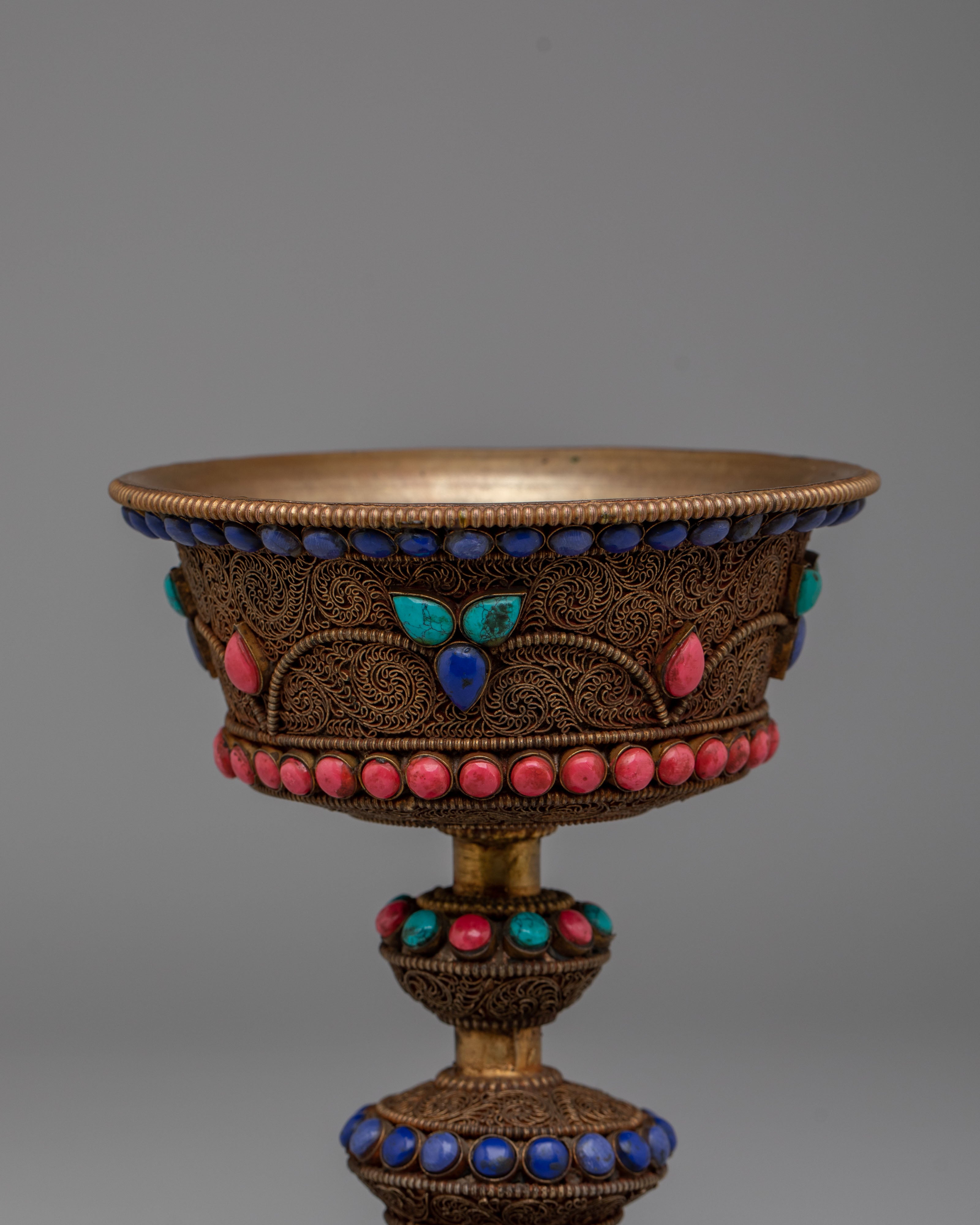 The Tibetan Buddhist Butter Lamp For Offering is a sacred ritual item used in Tibetan Buddhism to symbolize the illumination of wisdom and the dispelling of ignorance. Measuring 19.5 cm in height and 10 cm in diameter, with an inner depth of 5 cm and a base of 9.5 cm, this lamp weighs 0.78 kg. The lamp is crafted from copper and features intricate filigree work, enhanced with natural turquoise, coral, and lapis stones, making it both a spiritual offering tool and an exquisite decorative piece for your sacred space.