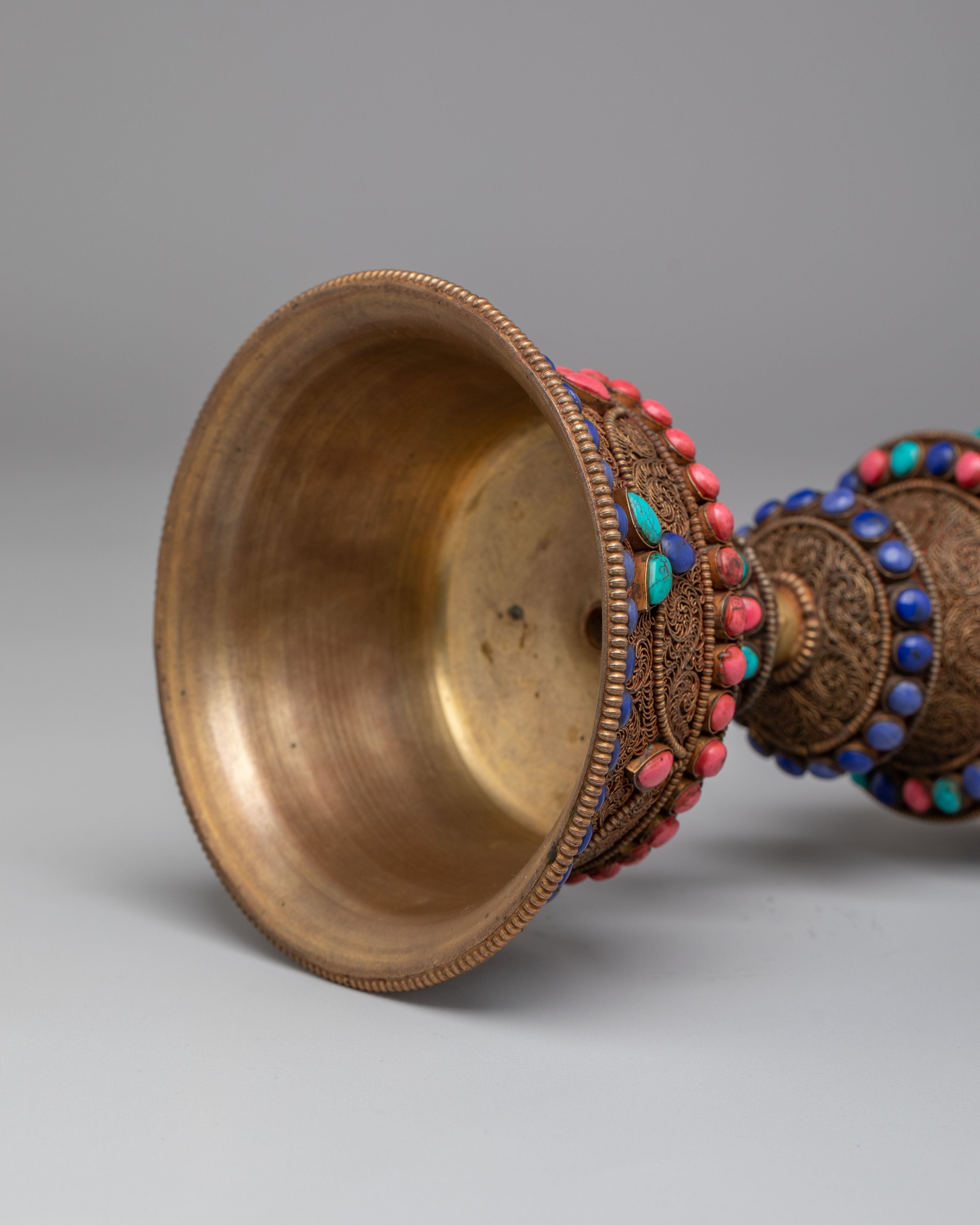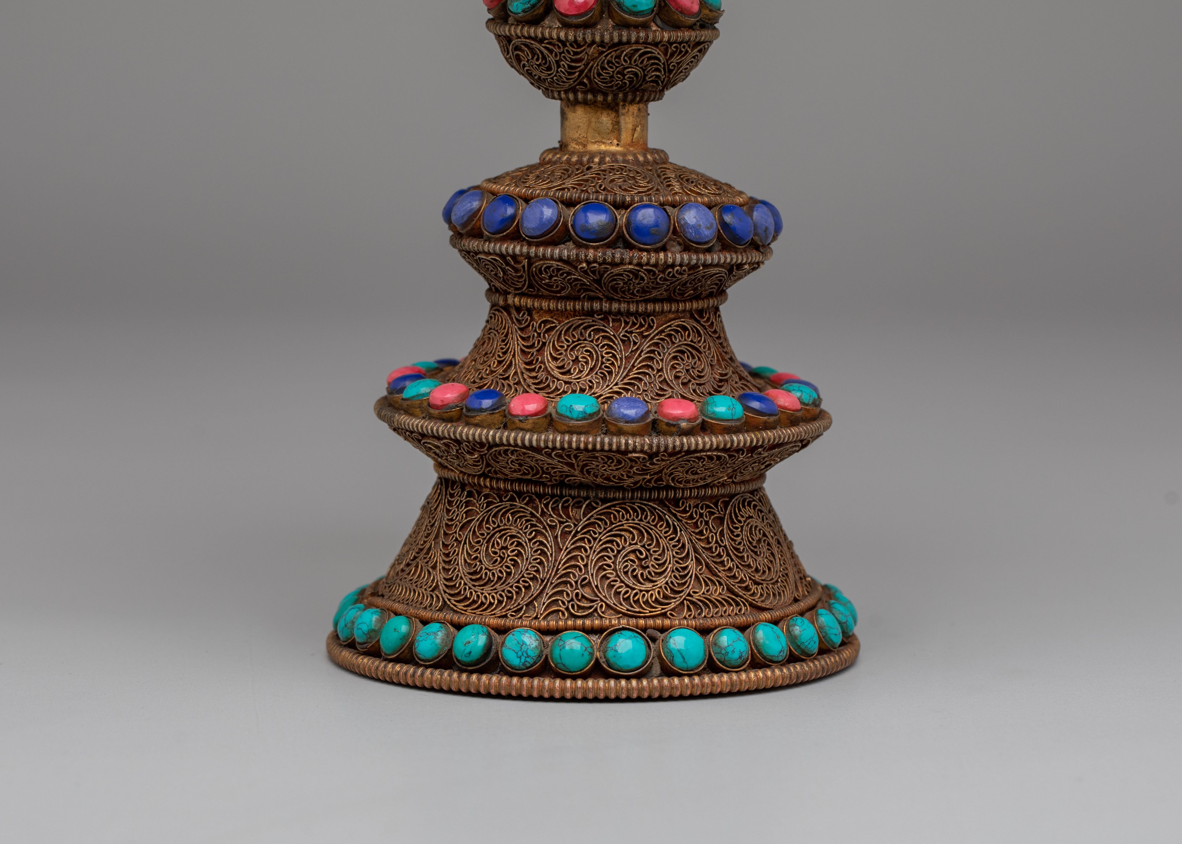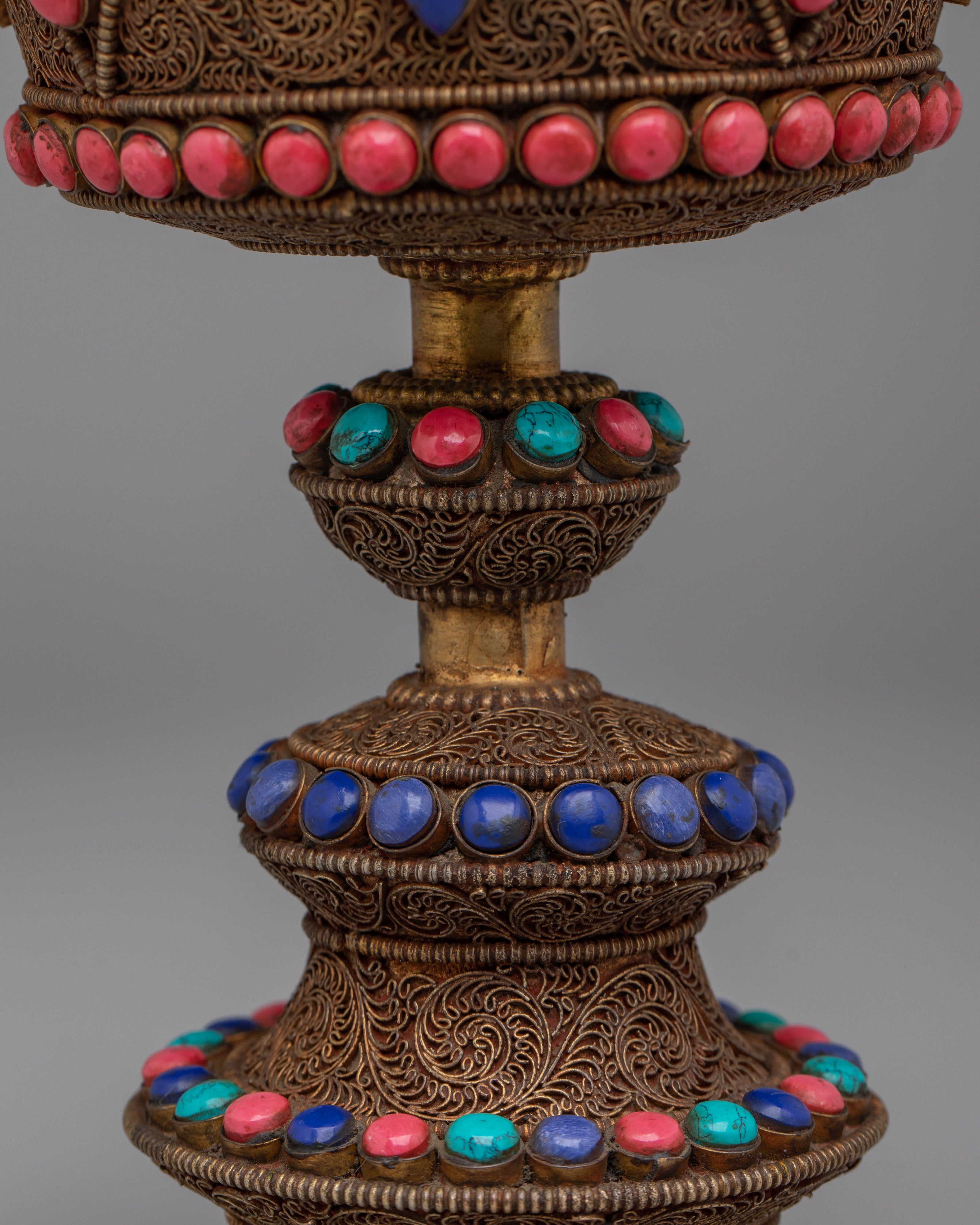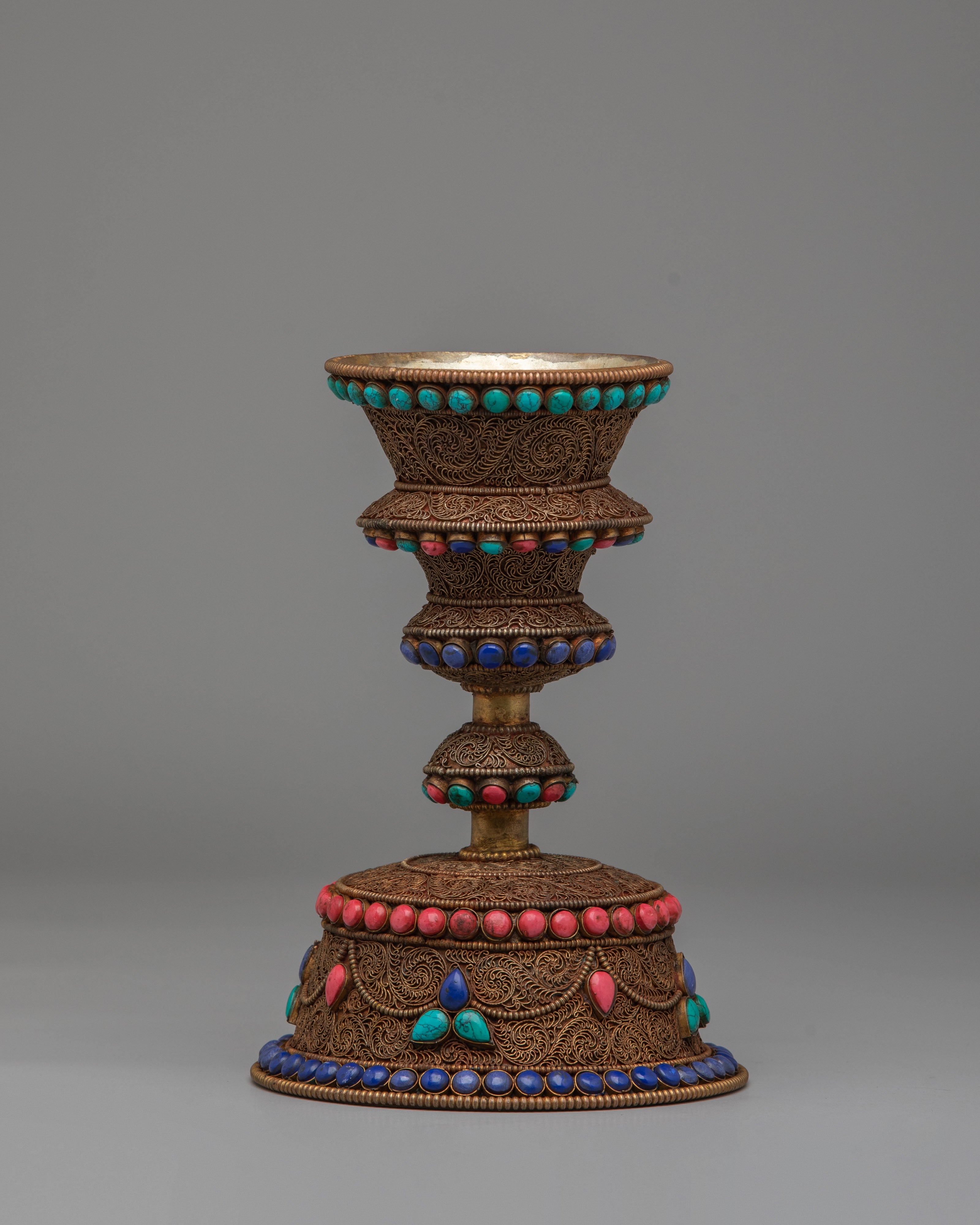 The Tibetan Butter Lamp represents the light of wisdom and the dispelling of darkness, both literal and metaphorical, in Tibetan Buddhist rituals. The three-tiered structure symbolizes spiritual progression, where the base represents stability, the middle signifies balance, and the upper part represents enlightenment and the highest state of wisdom. The gemstone inlays—turquoise, coral, and lapis lazuli—are believed to symbolize the five elements, bringing protection, clarity, and positive spiritual energy. The lamp, traditionally filled with butter or oil, symbolizes the offering of light to deities, purifying the environment and invoking blessings. Its design serves as a reminder of the illumination of the mind and the path to enlightenment, transforming ignorance into understanding and offering a sacred light that guides the practitioner on their spiritual journey.