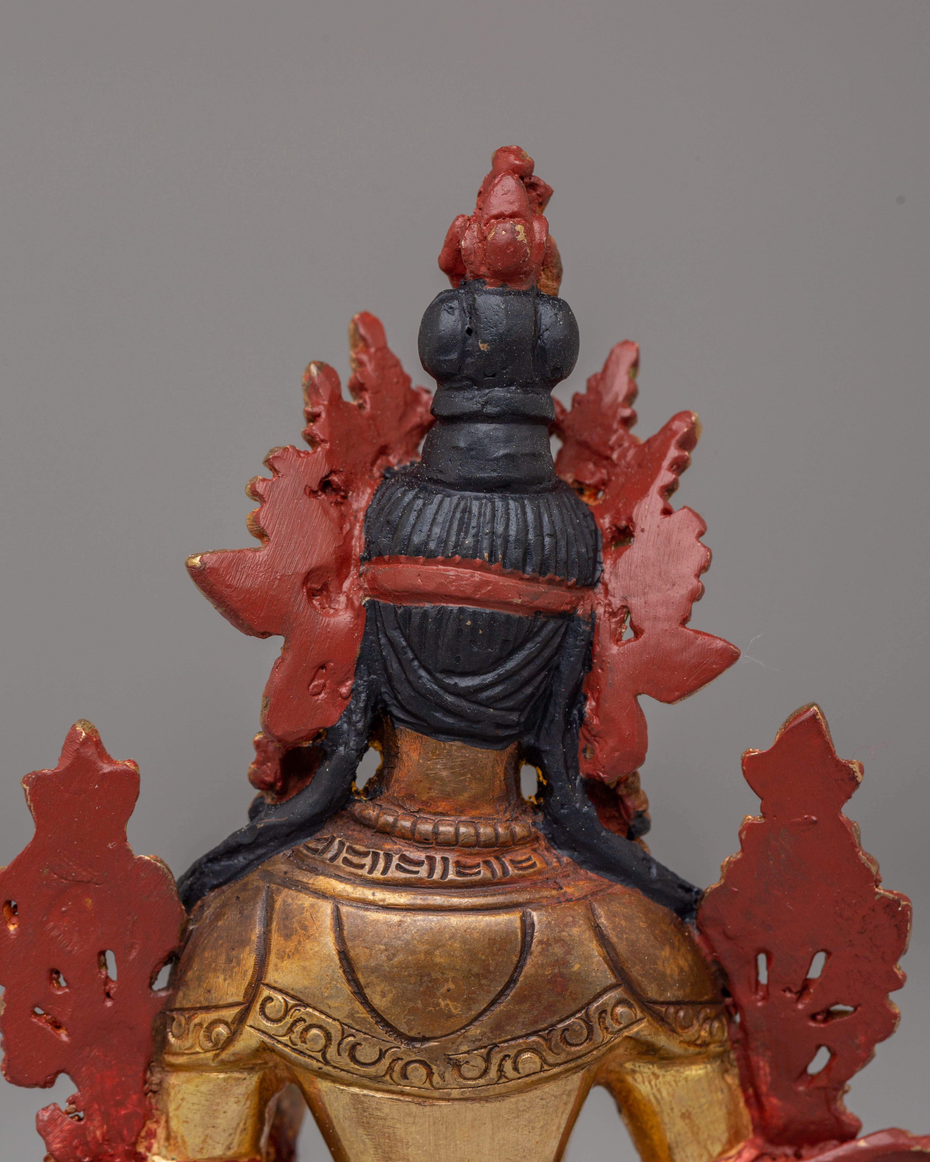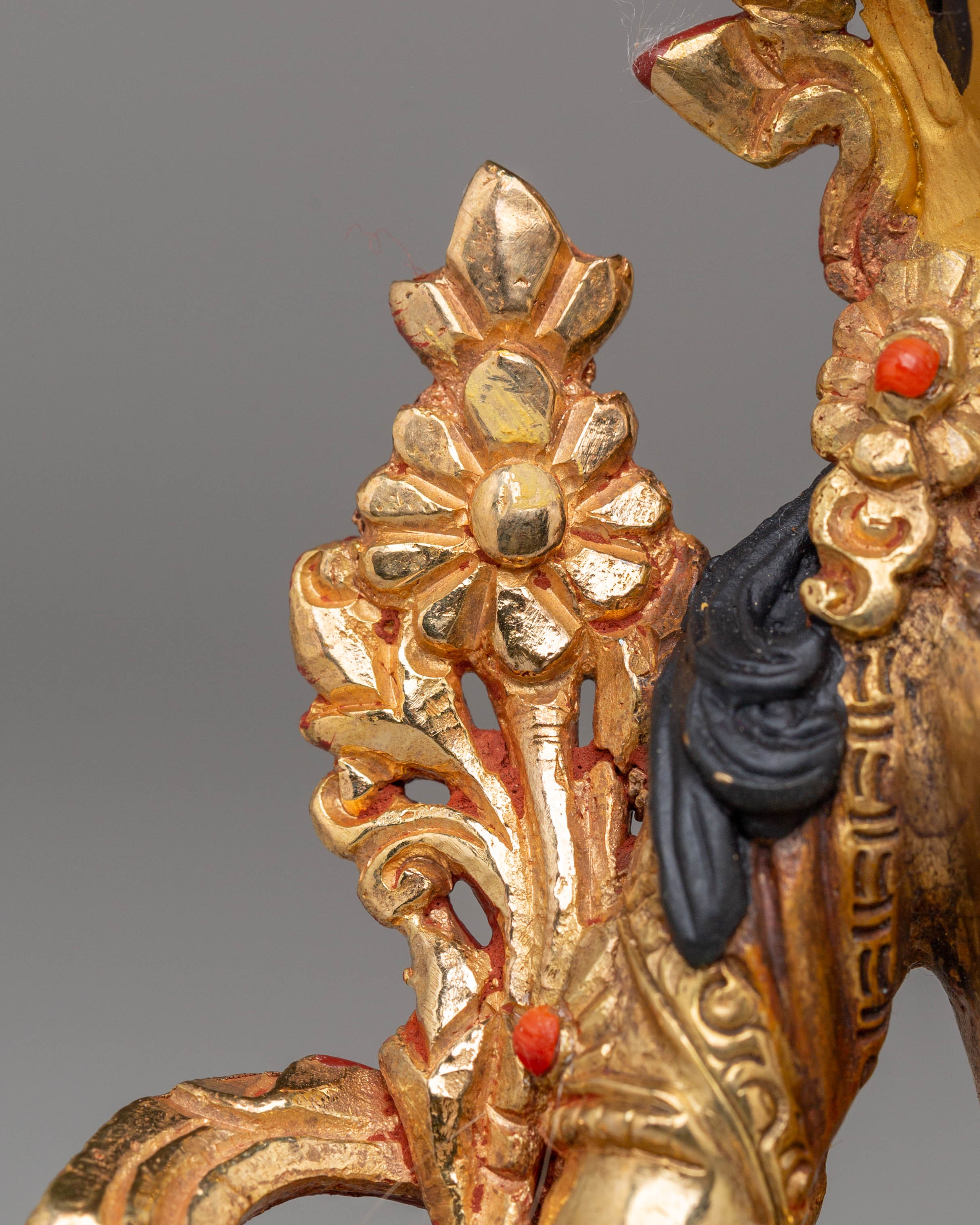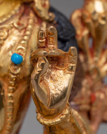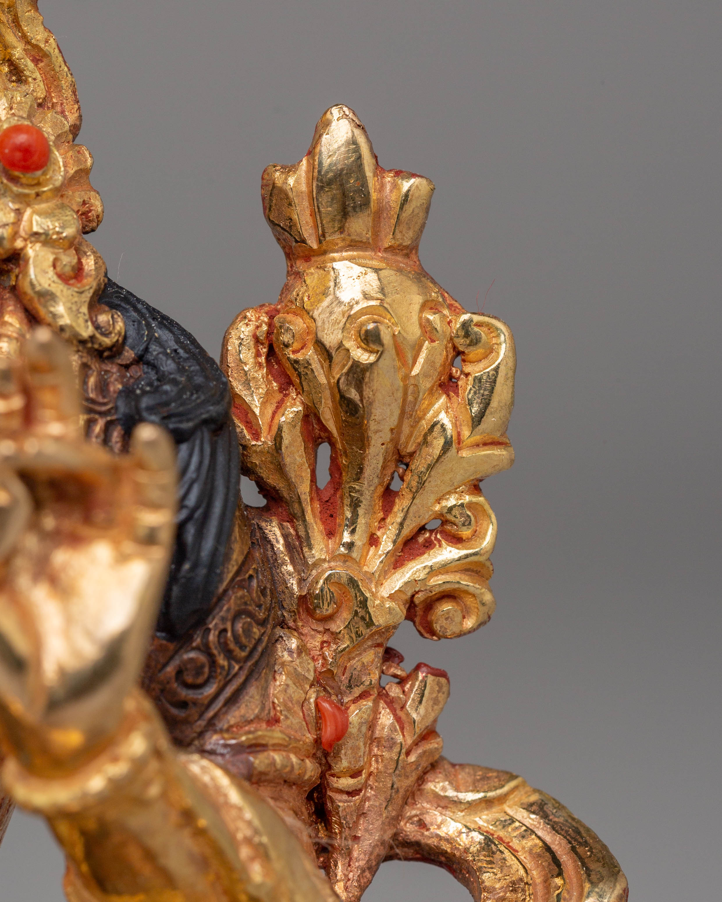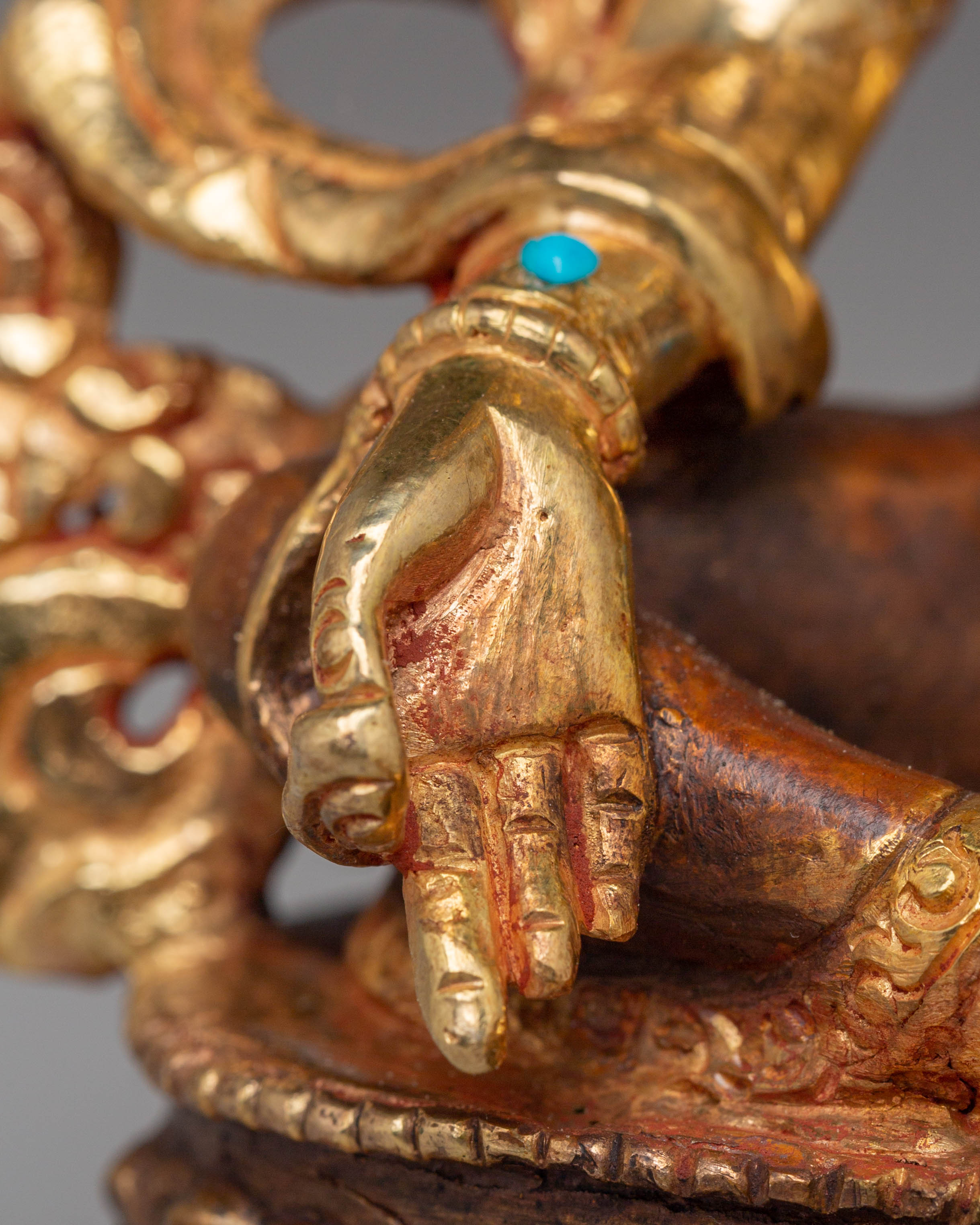 This handcrafted Green Tara statue embodies compassion and serenity, serving as a powerful symbol of protection and guidance. Crafted from copper and adorned with 24K gold plating, it features acrylic color detailing and gemstones. Standing 14cm tall and 10cm wide, this sacred piece radiates peace and grace, making it an ideal addition to any altar, meditation space, or home decor. The intricate design captures Green Tara’s serene expression and elegant posture, inviting positive energy and spiritual balance into your environment.