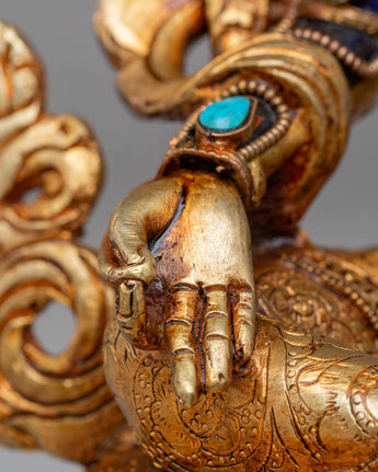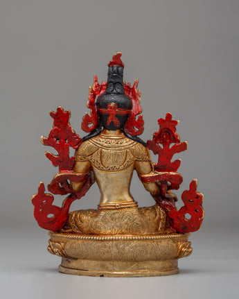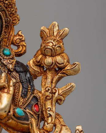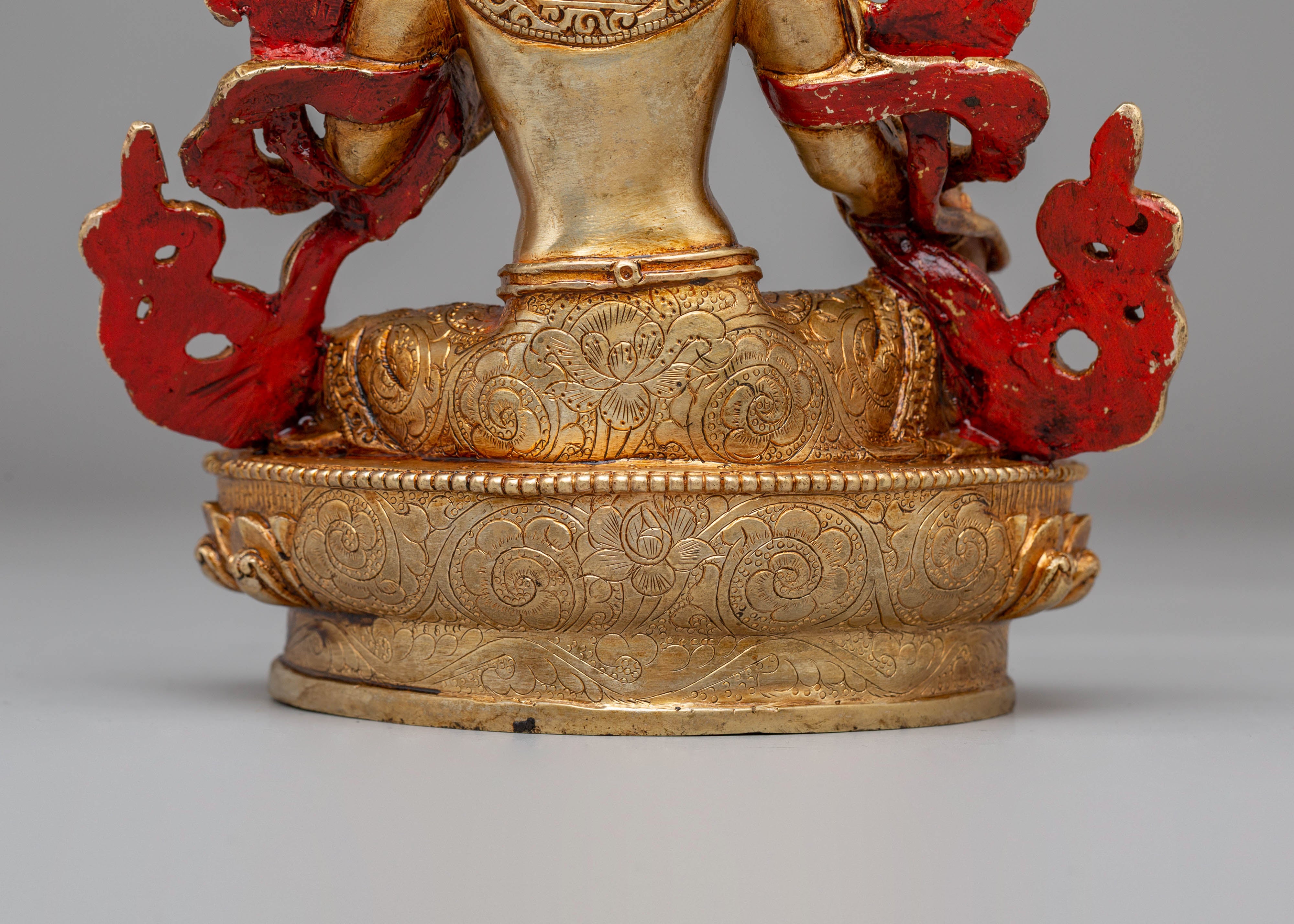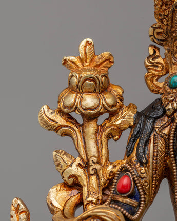 Green Tara's iconography is rich with symbolism, each gesture and element representing her attributes of compassion, protection, and swift action. Her right hand is positioned in varadha mudra, the gesture of offering, which signifies her willingness to grant blessings, assistance, and compassion to all beings. Her left hand is held in the three-jeweled mudra, symbolizing the Three Jewels of Buddhism: the Buddha, the Dharma (teachings), and the Sangha (community), representing her role as a protector and guide on the path to enlightenment. The right leg extended forward indicates her readiness to act swiftly, a key attribute of Green Tara, as she is often called upon for her quick intervention and help in times of need. Her crown represents her enlightened state, symbolizing her wisdom and spiritual sovereignty. The right leg holding an utpala flower signifies her purity and the blossoming of spiritual potential. Finally, the lotus base upon which Green Tara stands symbolizes her emergence from the depths of samsara (the cycle of birth, death, and rebirth), embodying her purity, spiritual awakening, and the potential for all beings to attain enlightenment. Each element in her iconography reinforces Green Tara’s role as a powerful force of compassion and protection.