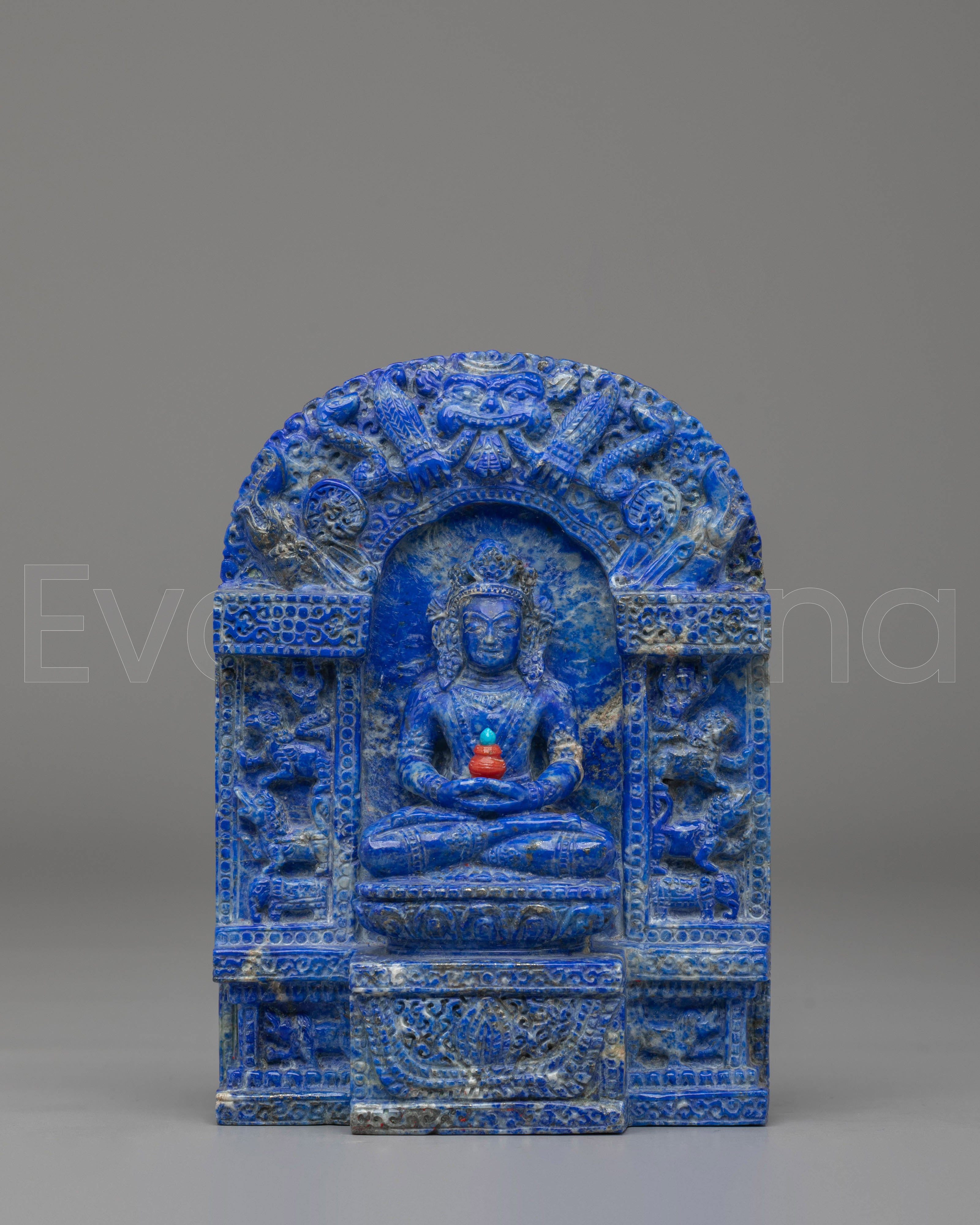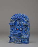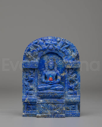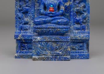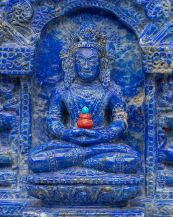 The design of the Amitayus Buddha Statue is rich in symbolism. Coral red stone represents vitality, passion, and protection, while turquoise is known for its healing properties and spiritual balance. The full-body lapis lazuli provides a deep, celestial blue hue, symbolizing wisdom, clarity, and divine guidance. The serene expression of Amitayus, along with his graceful posture, embodies calmness and compassion, reminding practitioners of the importance of cultivating spiritual health and well-being. Each stone is carefully integrated into the design to enhance both the statue's beauty and its spiritual energy.