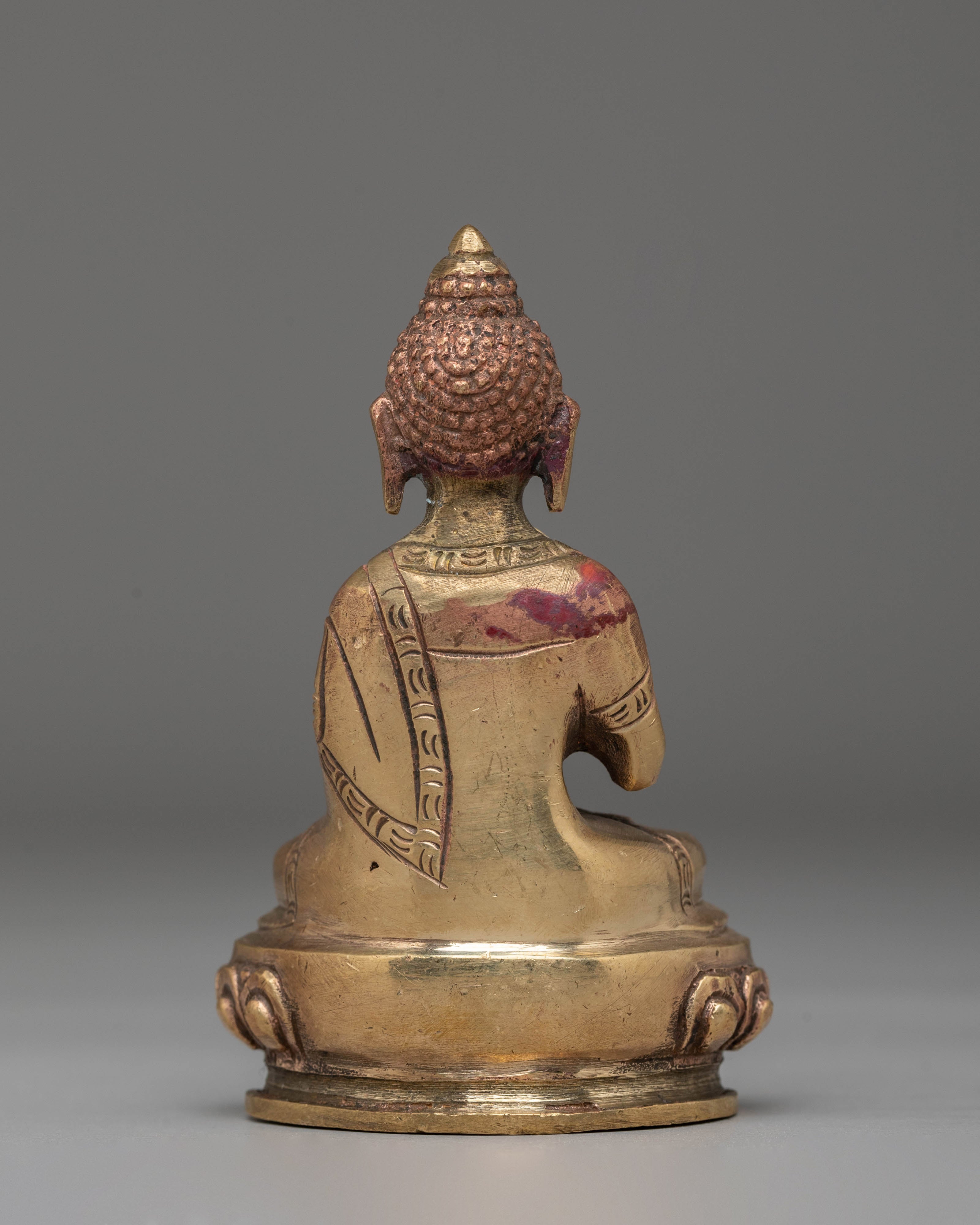 This handcrafted Buddhist Amogasiddhi statue beautifully represents the Buddha of Fearlessness and Spiritual Power. Standing 8 cm tall and 5.5 cm wide, this copper body statue captures the essence of Amogasiddhi’s serene yet powerful presence. His right hand holds a sword, symbolizing the cutting through of ignorance and obstacles, while his left hand forms the Abhaya Mudra, offering protection and reassurance to those who seek it.