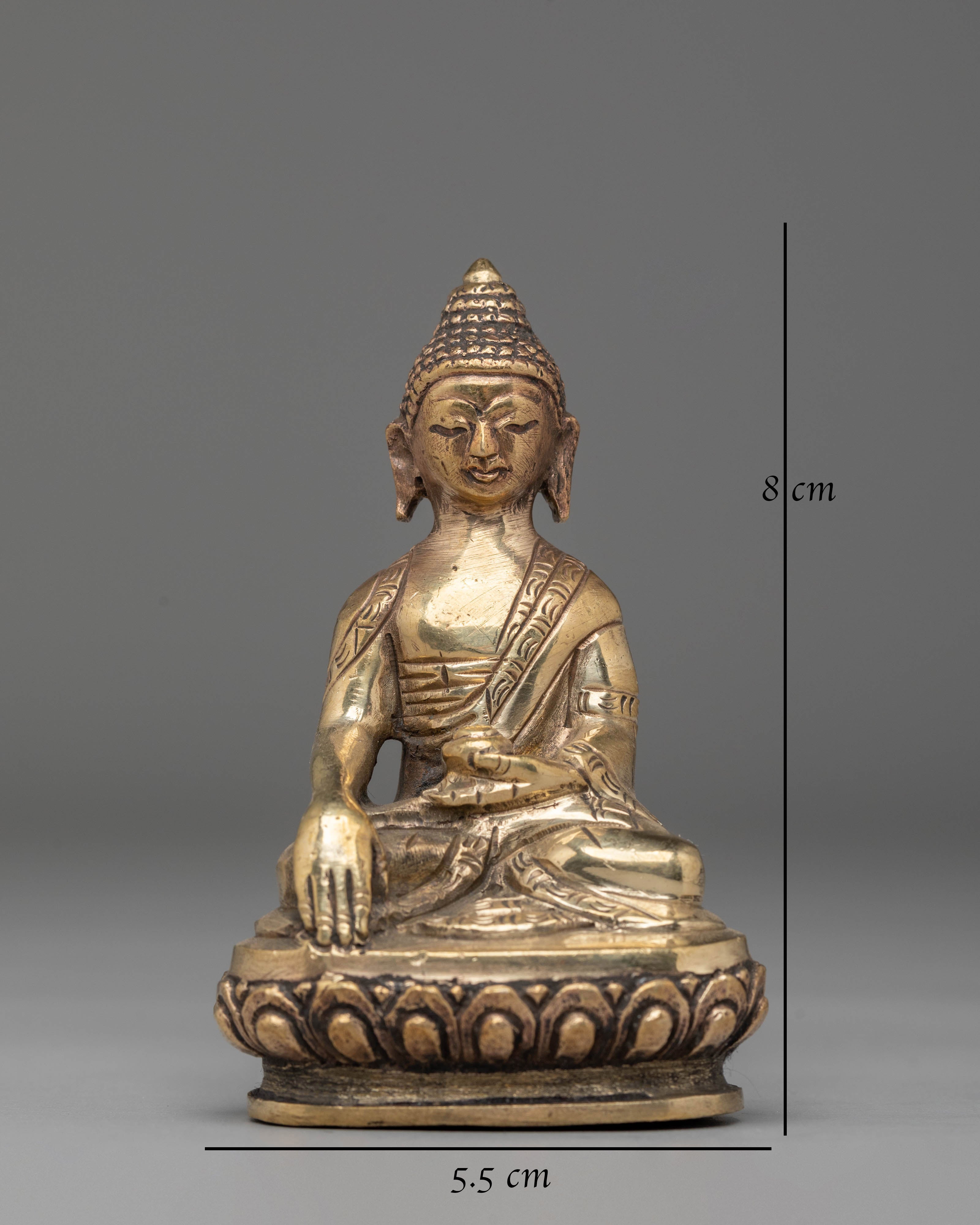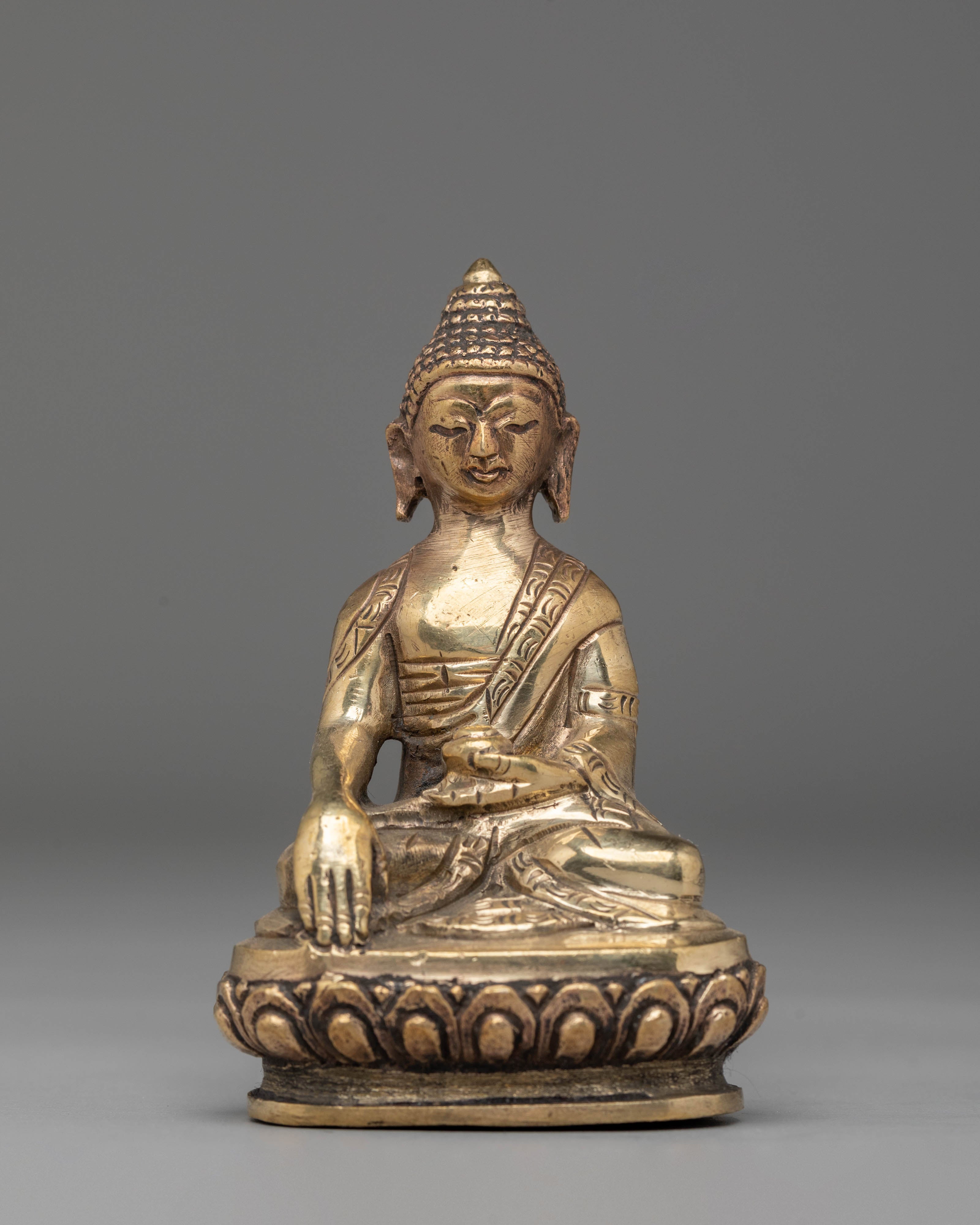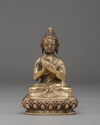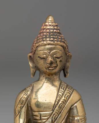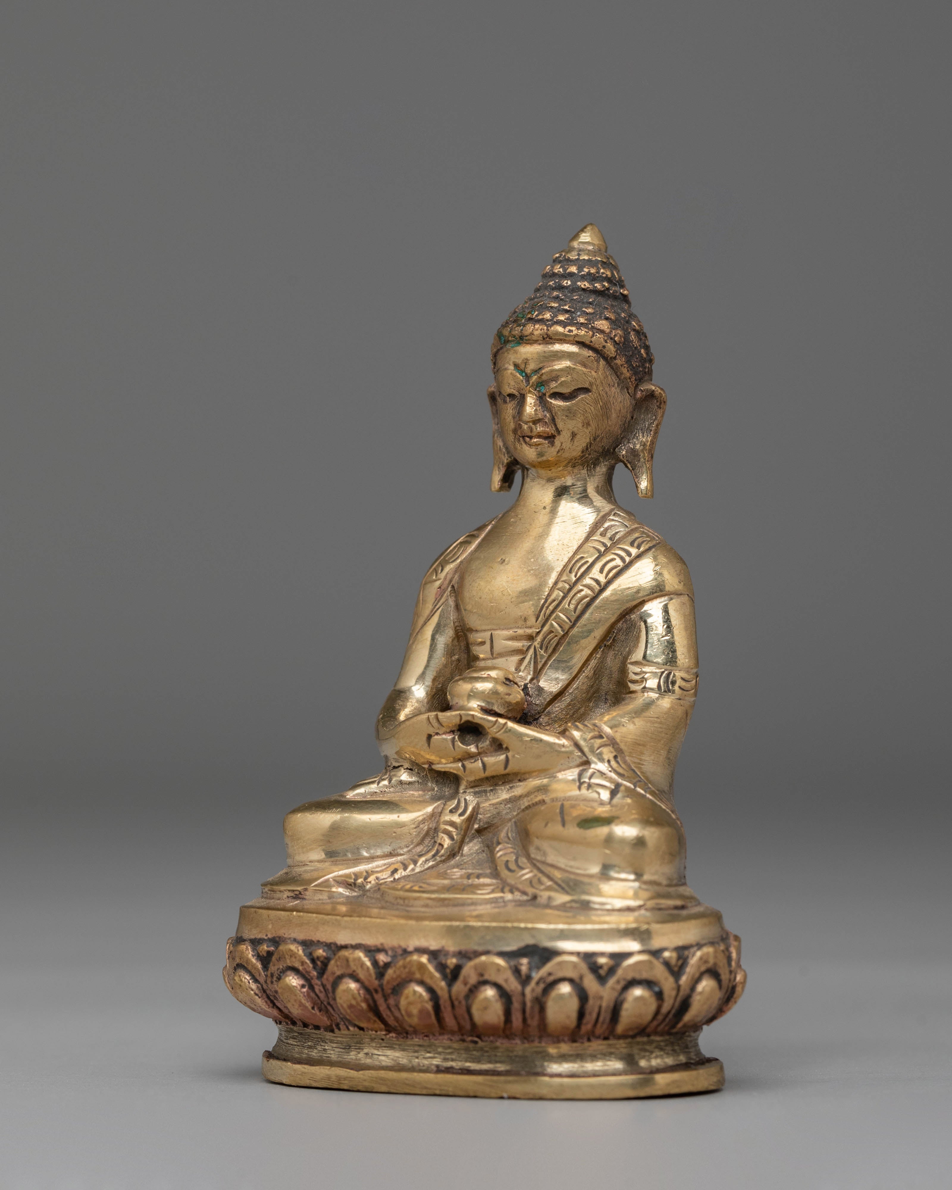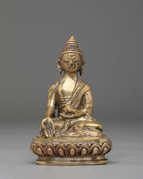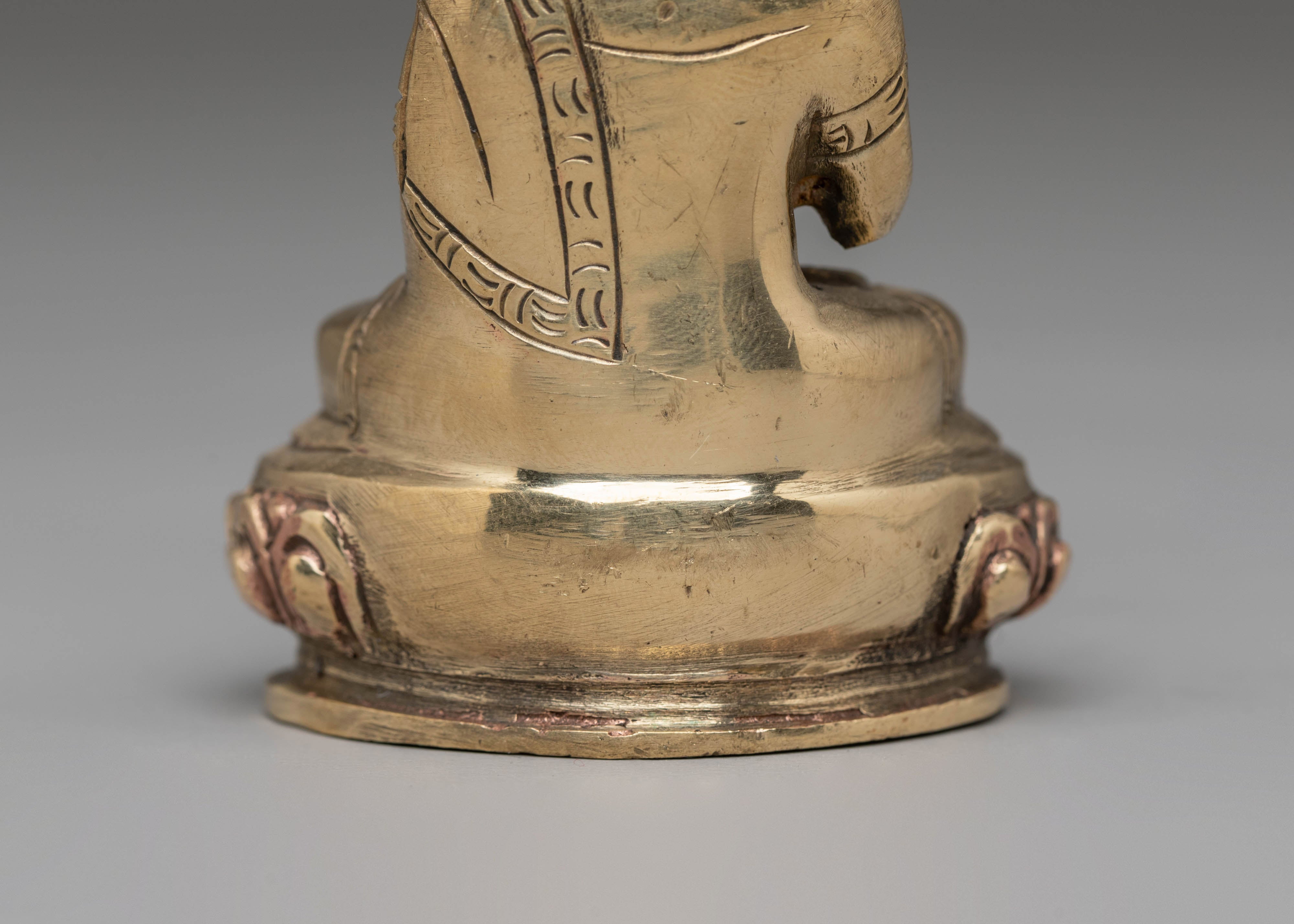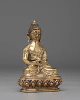 Shakyamuni Buddha is depicted sitting in the lotus pose (padmasana), indicating his steady concentration and mastery over the distractions of the material world. His right hand stretched toward the earth in bhumisparsha mudra represents his moment of enlightenment, inviting the earth to witness his waking. The left hand, lying gently in his lap in dhyana mudra, holding an alms bowl, depicts the profound state of meditation and mindfulness that leads to insight and clarity.