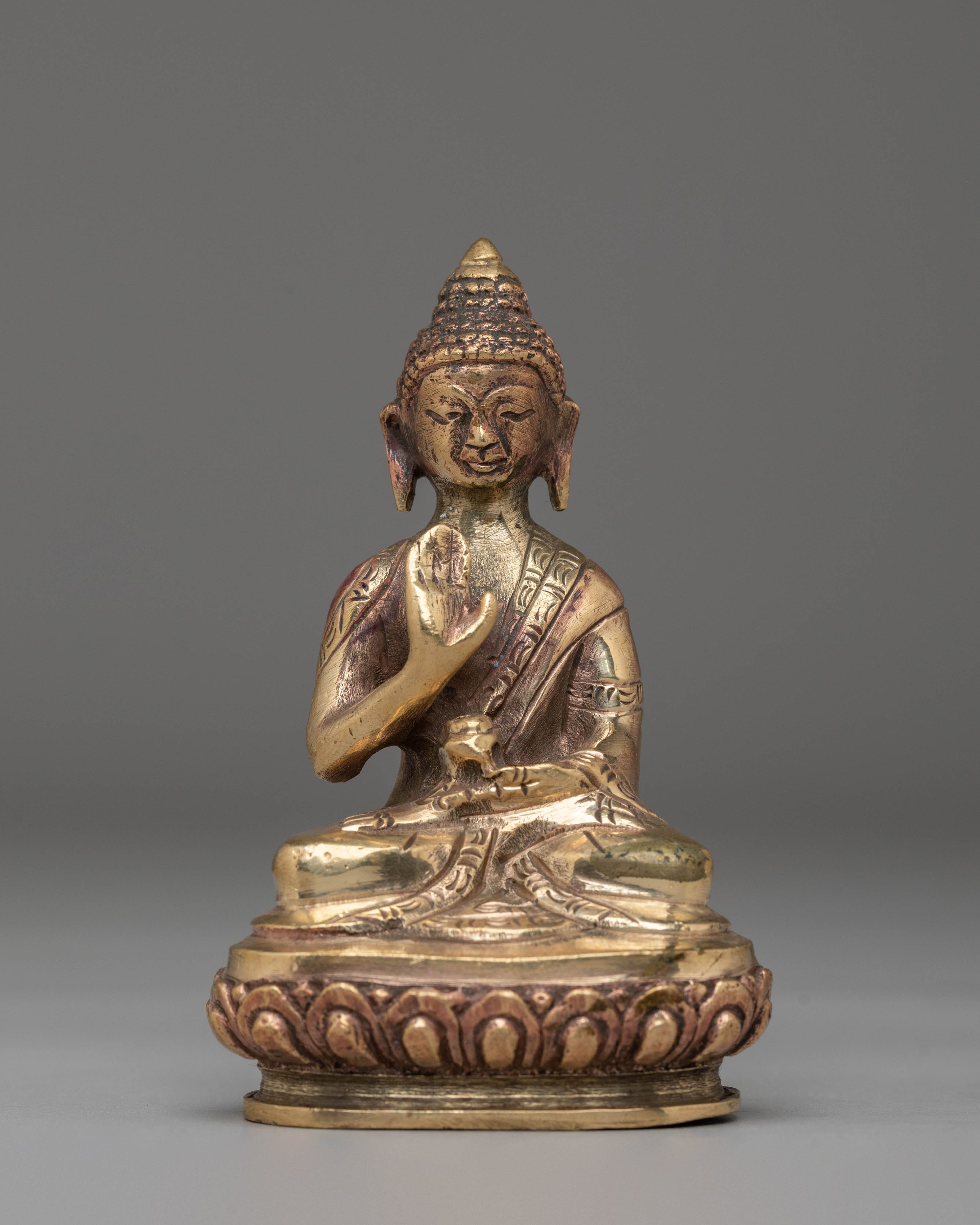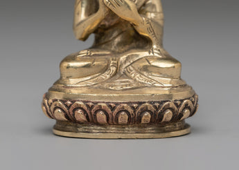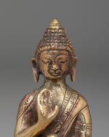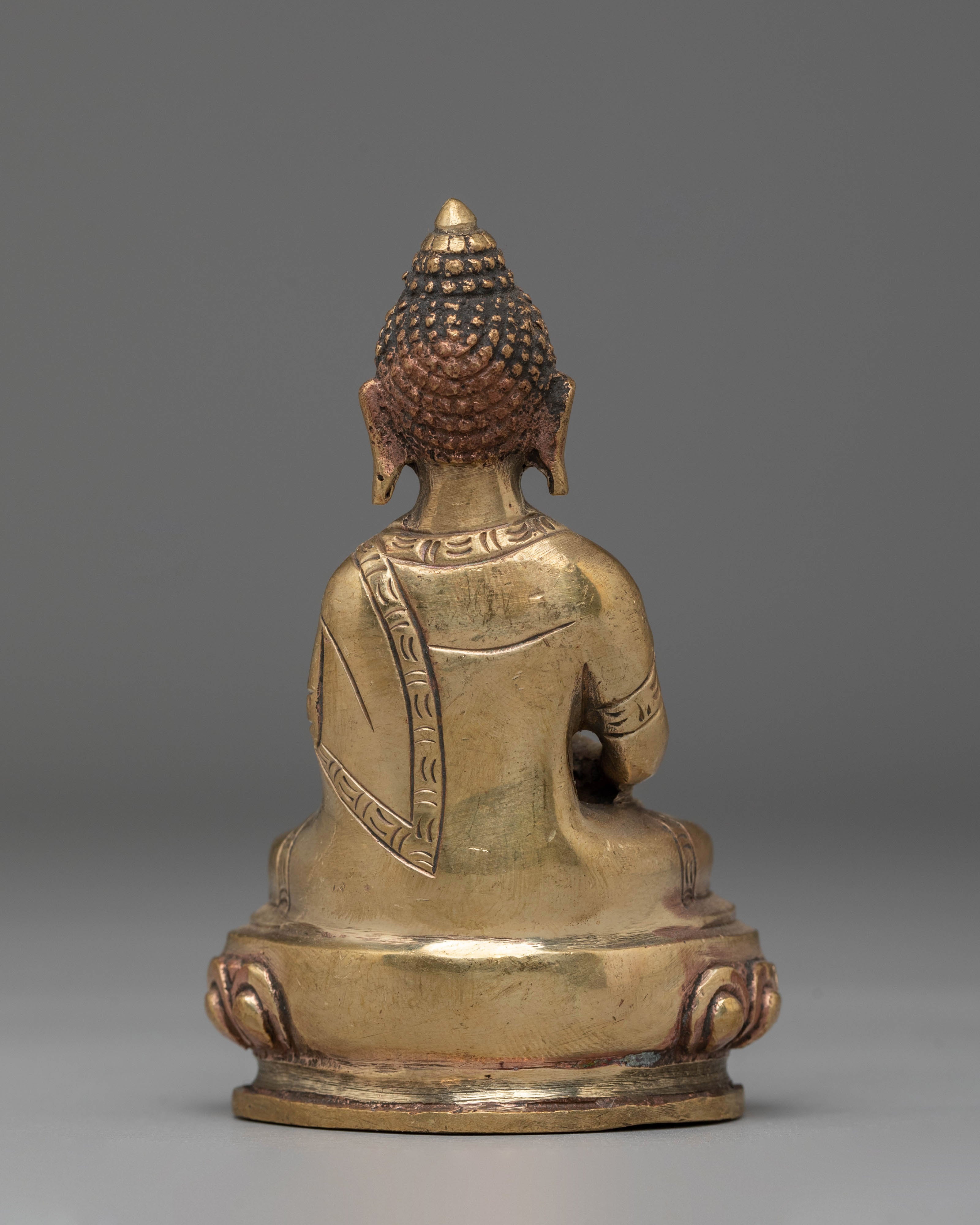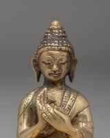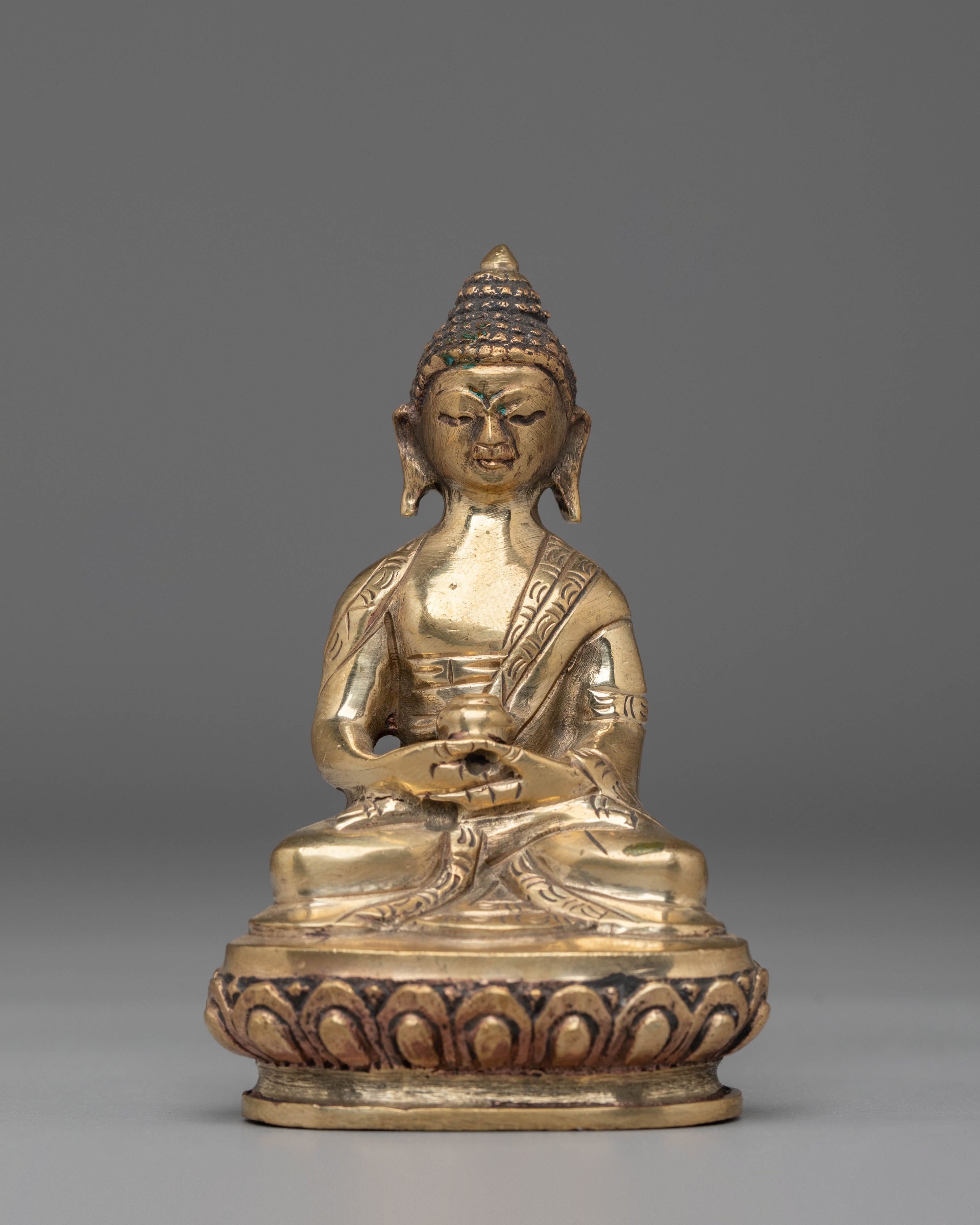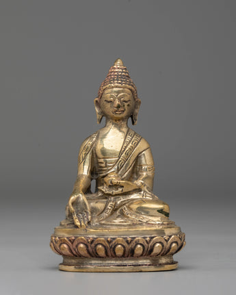 Shakyamuni Buddha is depicted sitting in the lotus pose (padmasana), indicating his steady concentration and mastery over the distractions of the material world. His right hand stretched toward the earth in bhumisparsha mudra represents his moment of enlightenment, inviting the earth to witness his waking. The left hand, lying gently in his lap in dhyana mudra, holding an alms bowl, depicts the profound state of meditation and mindfulness that leads to insight and clarity.
