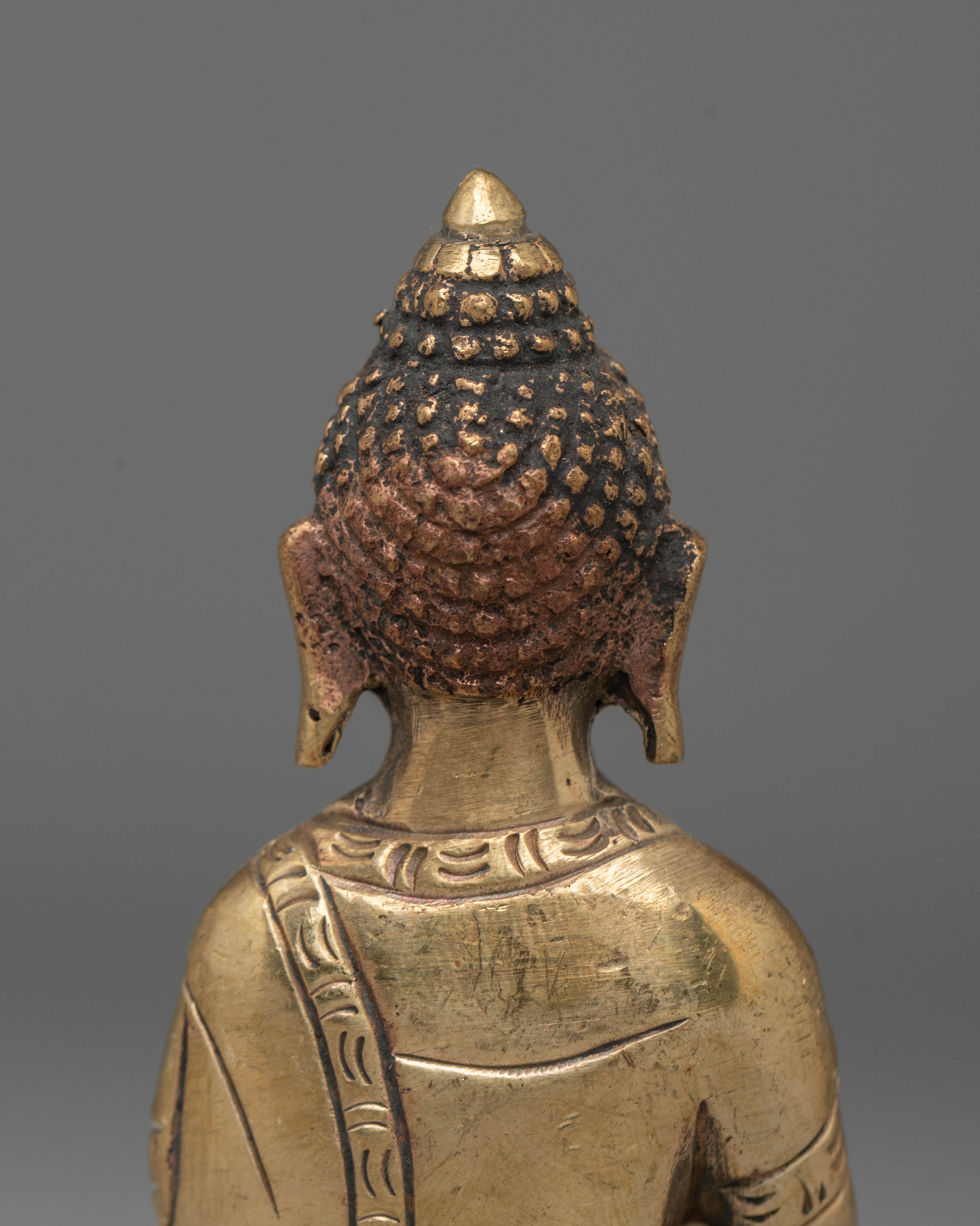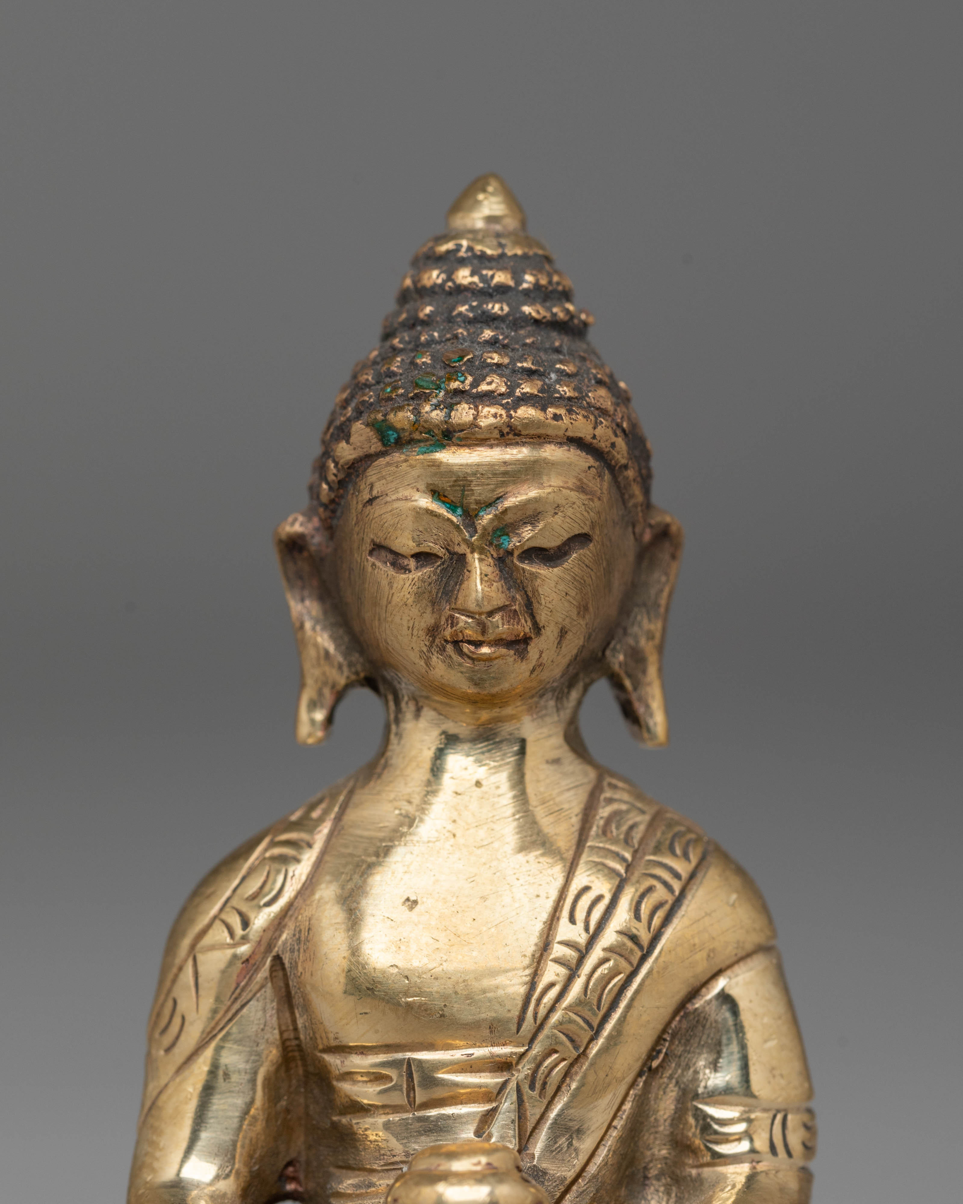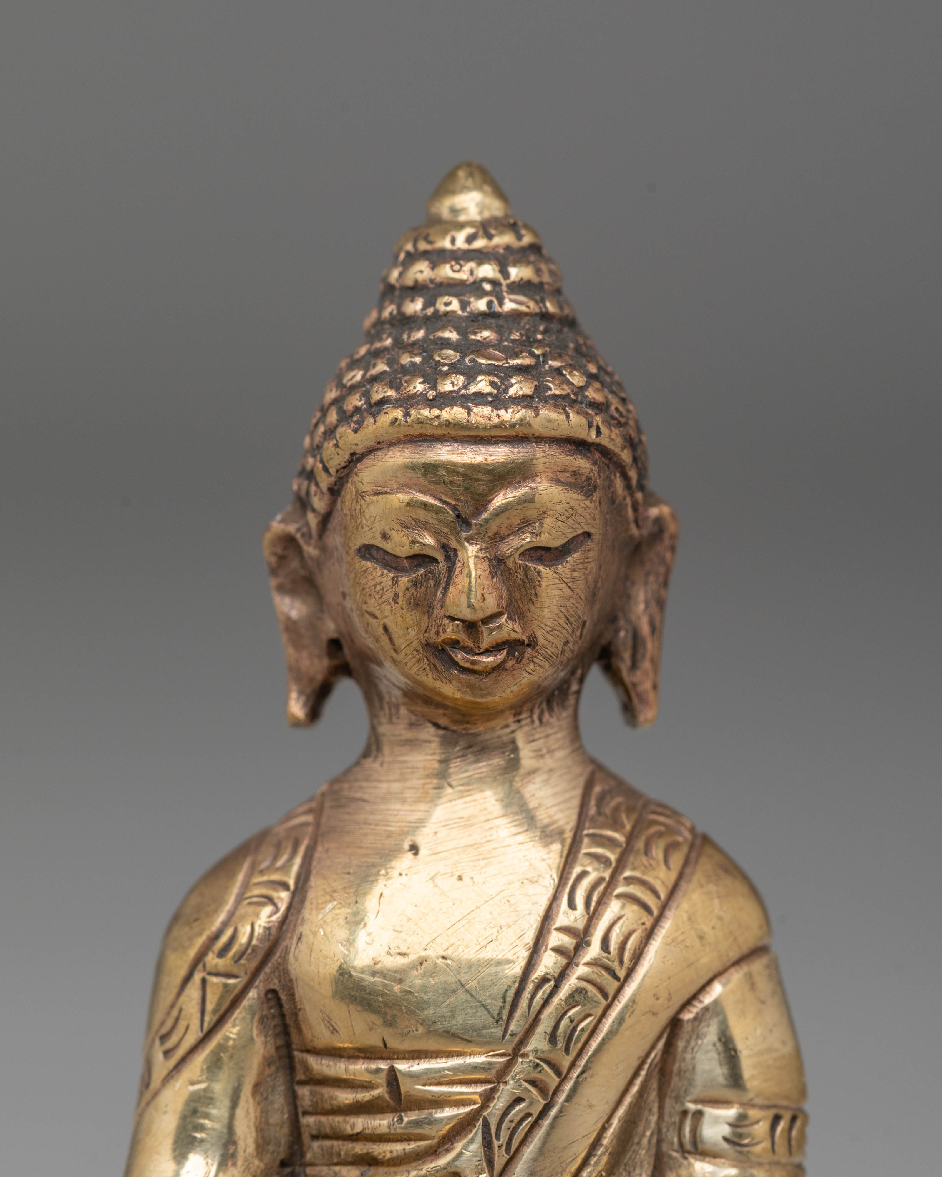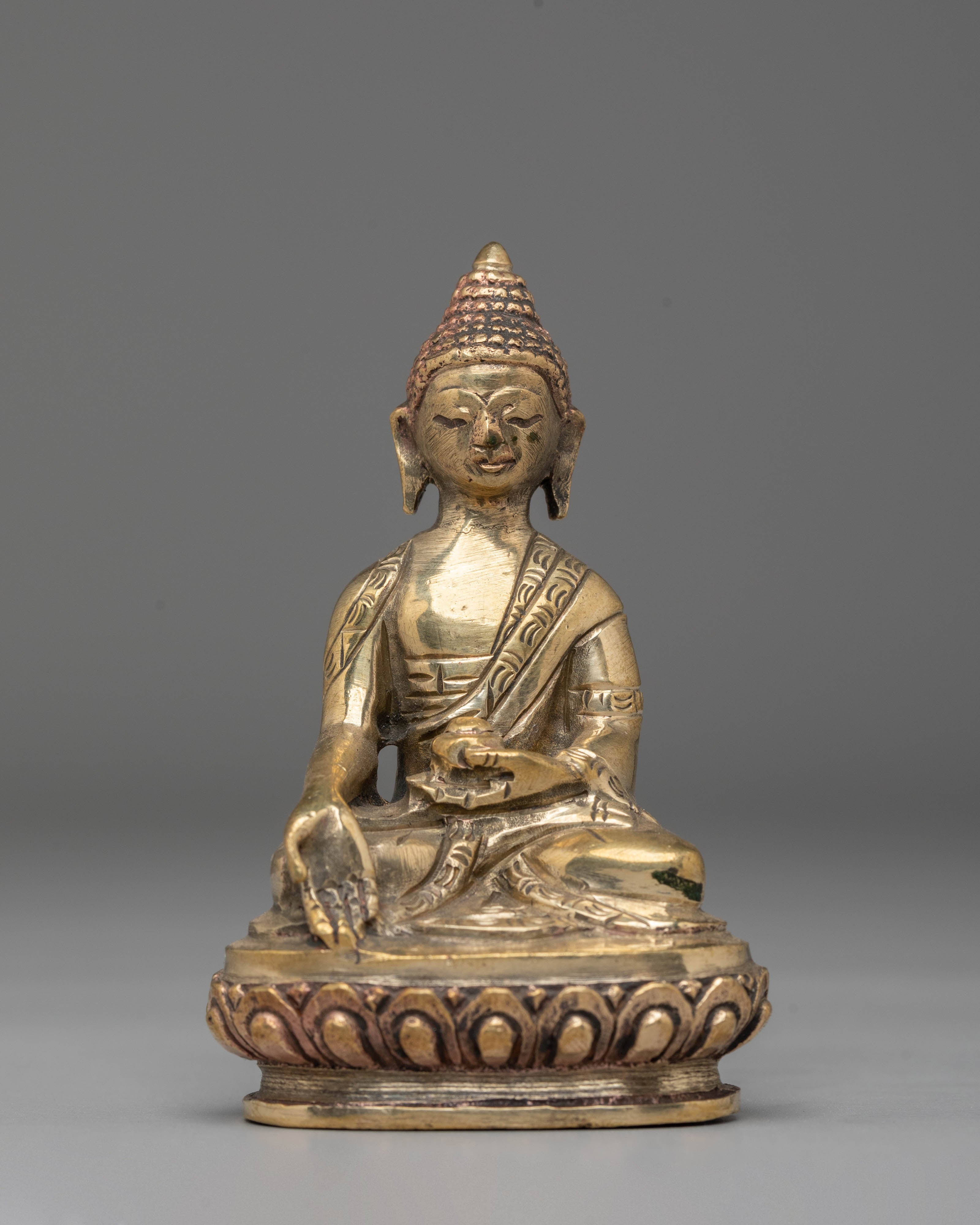 Shakyamuni Buddha is depicted sitting in the lotus pose (padmasana), indicating his steady concentration and mastery over the distractions of the material world. His right hand stretched toward the earth in bhumisparsha mudra represents his moment of enlightenment, inviting the earth to witness his waking. The left hand, lying gently in his lap in dhyana mudra, holding an alms bowl, depicts the profound state of meditation and mindfulness that leads to insight and clarity.