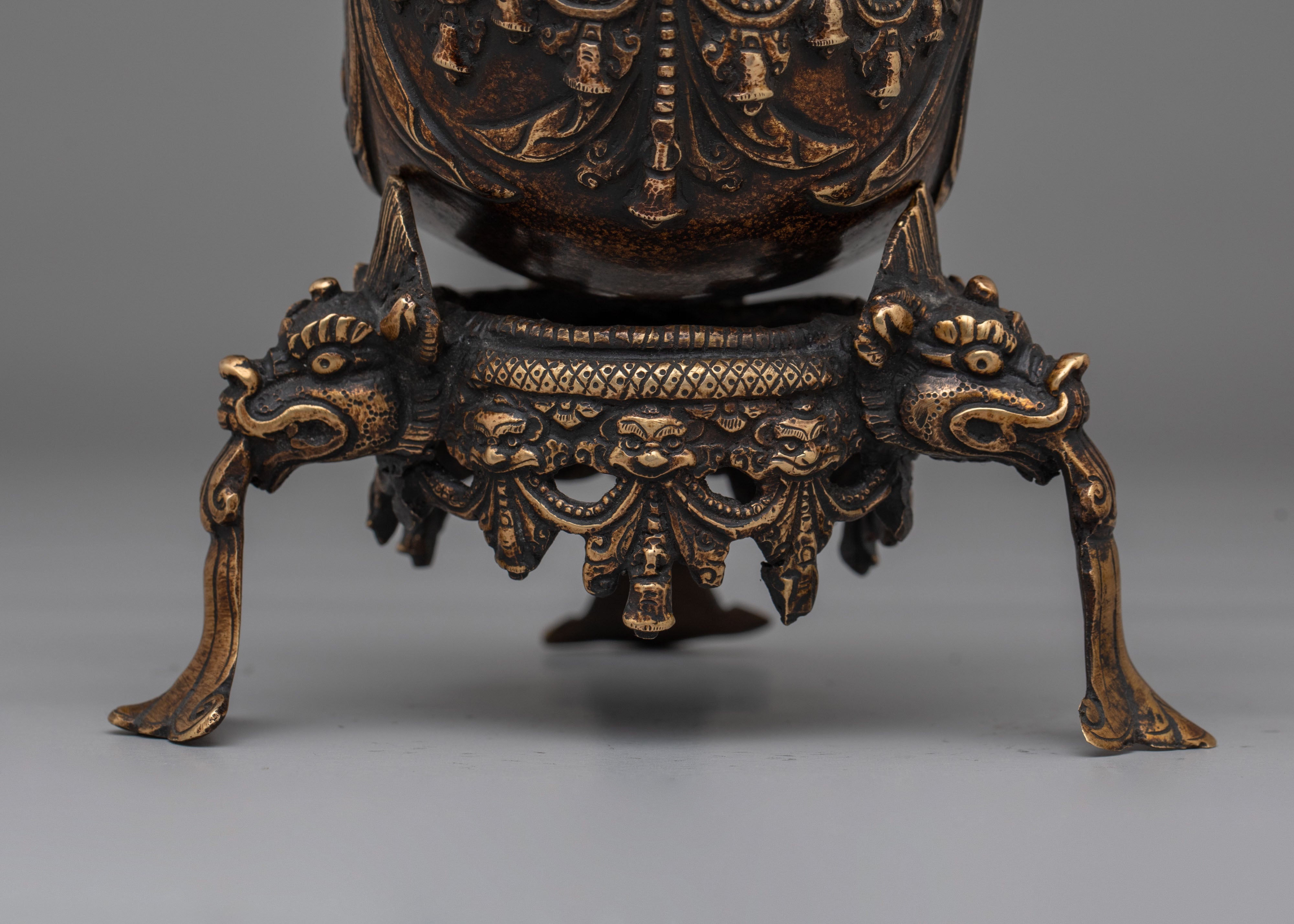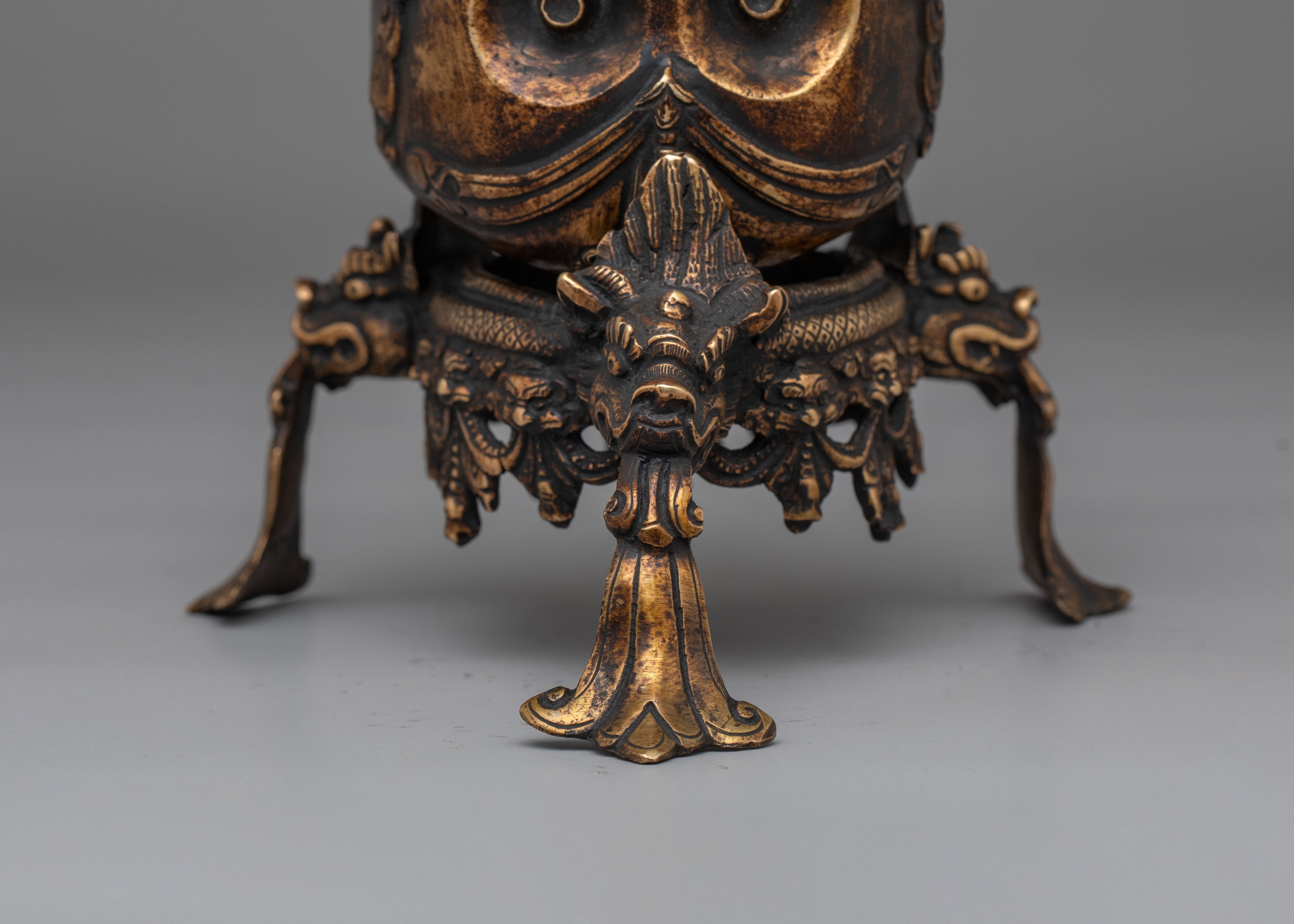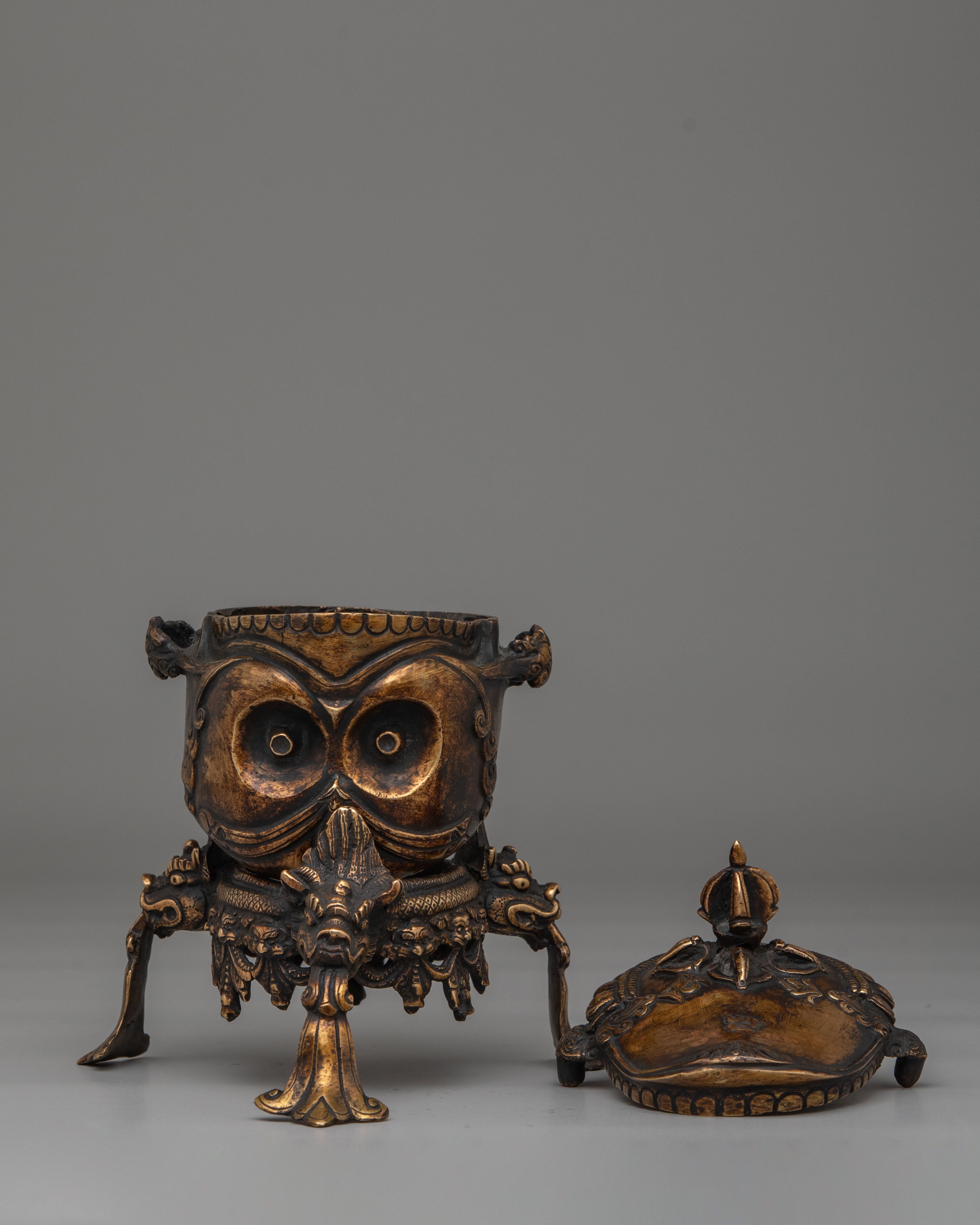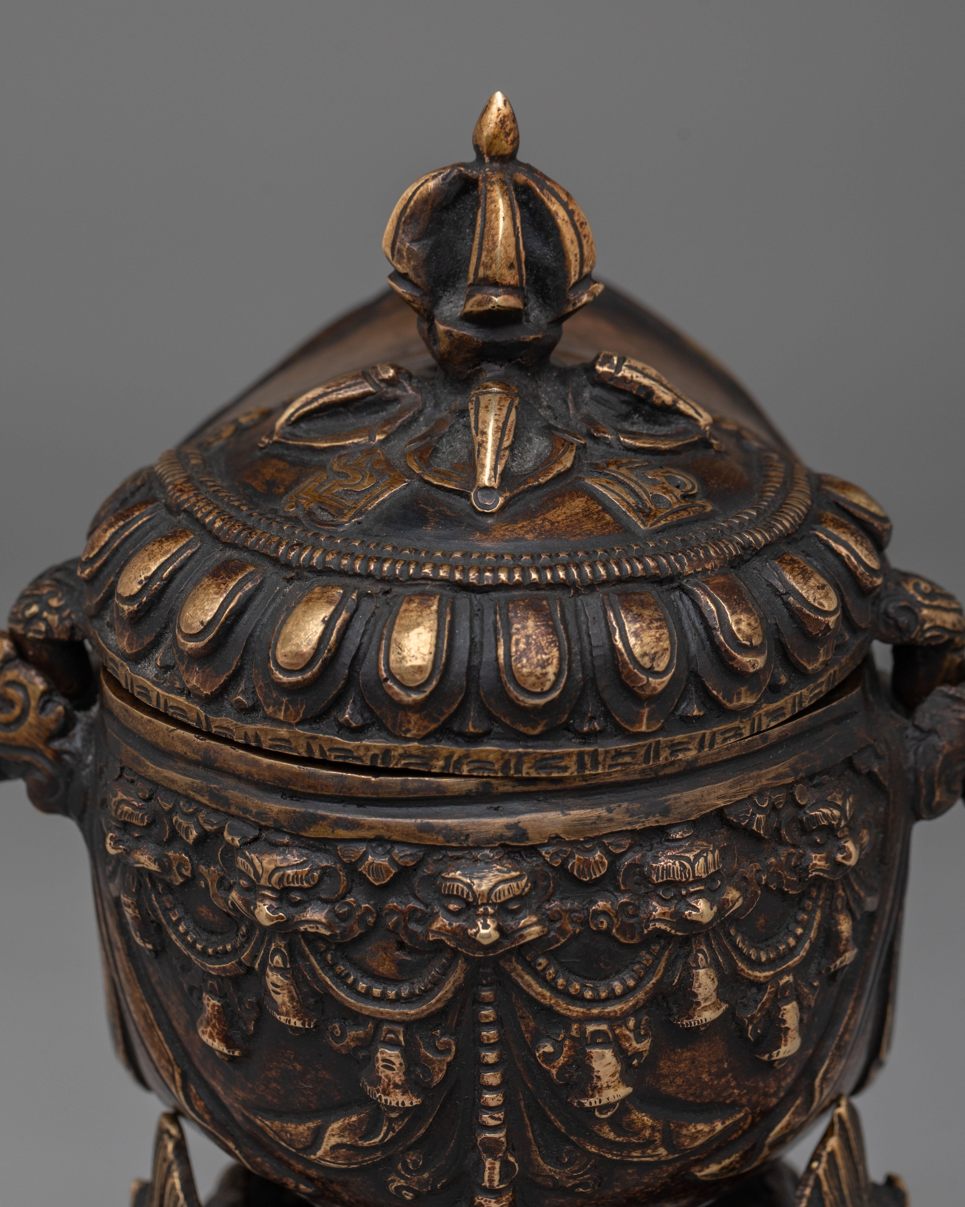 The copper body of the Kapala is adorned with ornate motifs, including decorative handles and a majestic lid that signify strength and protection. The antique finish enhances the ritualistic qualities of the Kapala, making it not only a functional tool but also a piece of art. This handcrafted vessel embodies the rich spiritual traditions of Tibetan Buddhism and serves as a reminder of the purification process during rituals, where offerings are made to invoke blessings, wisdom, and divine protection.