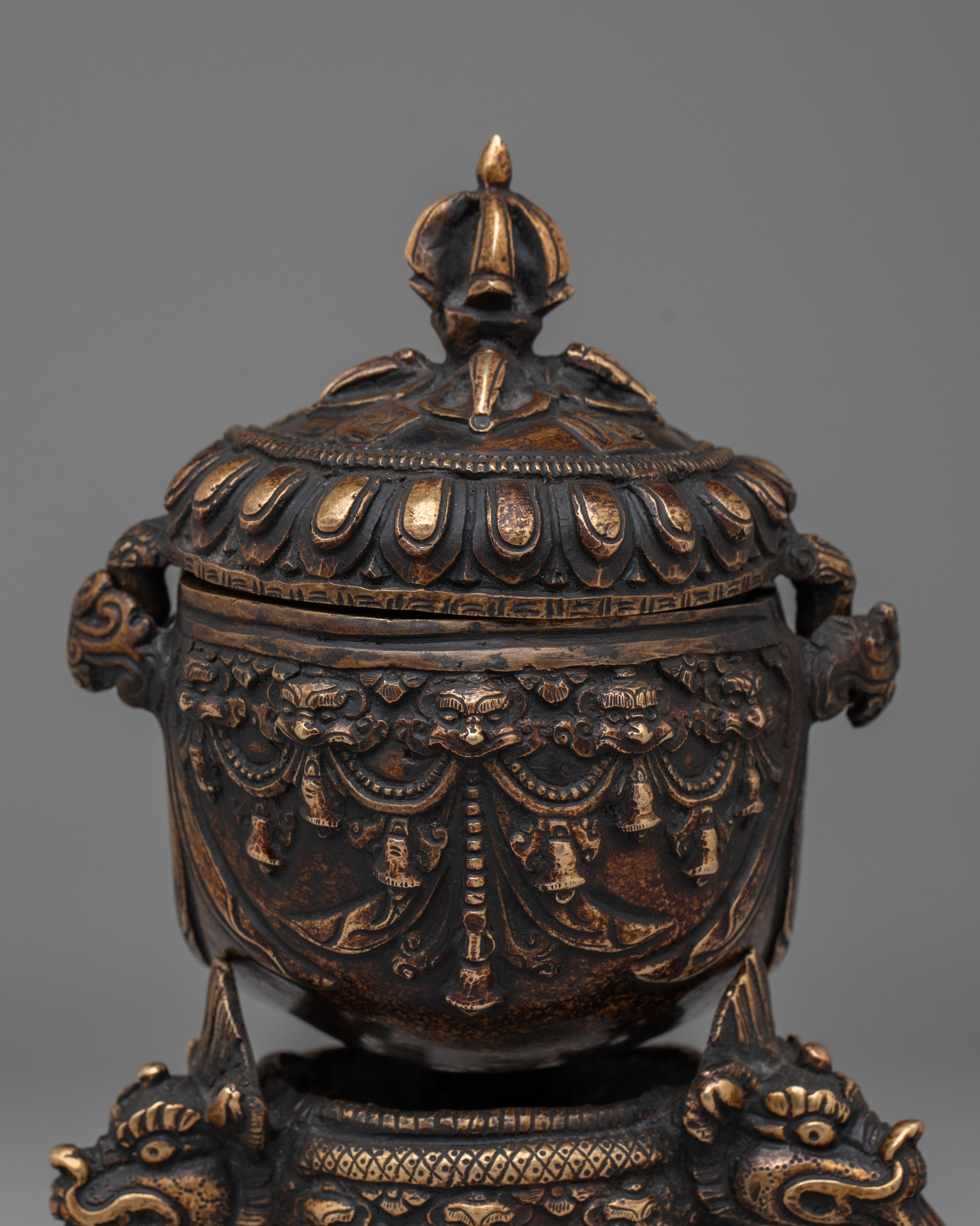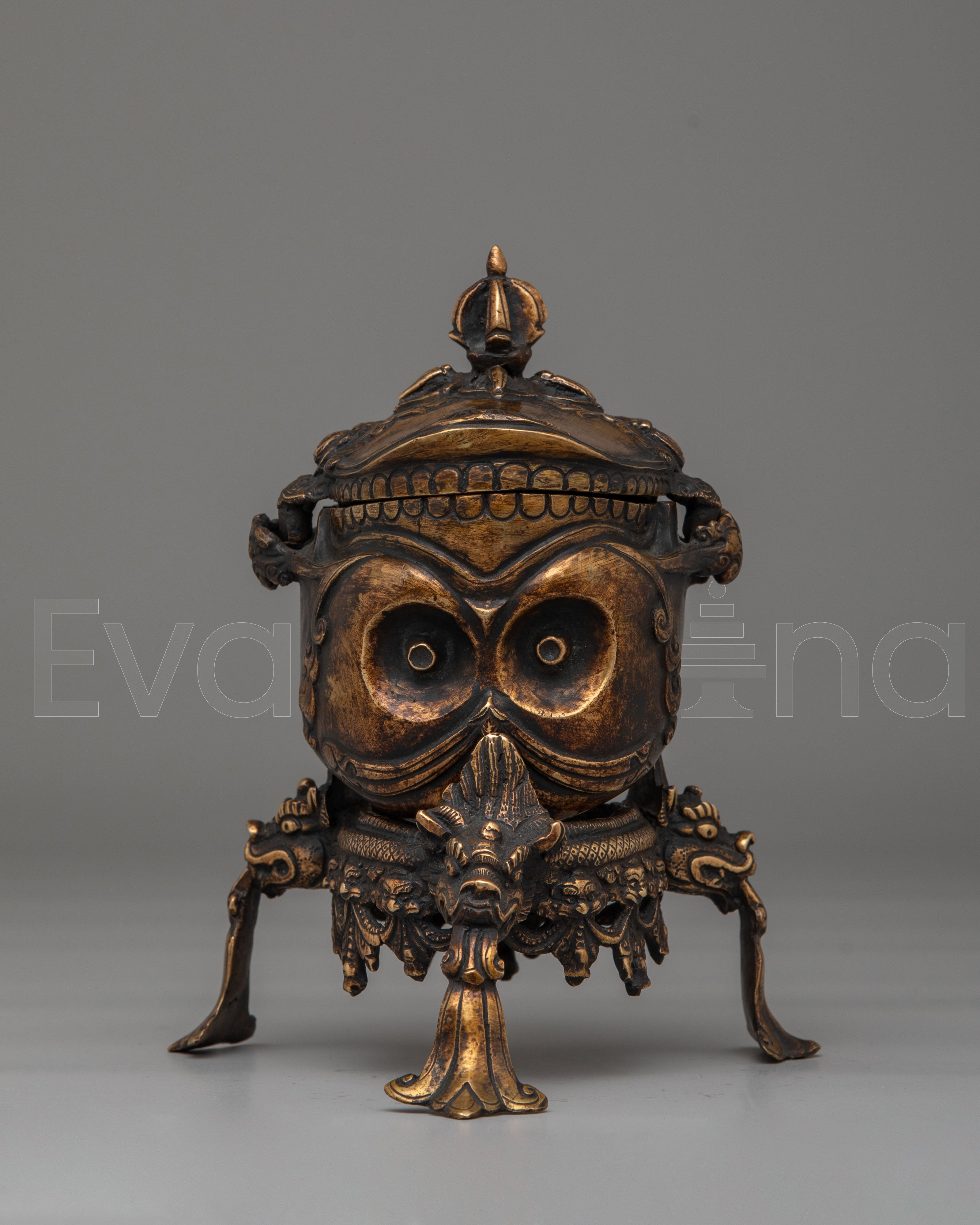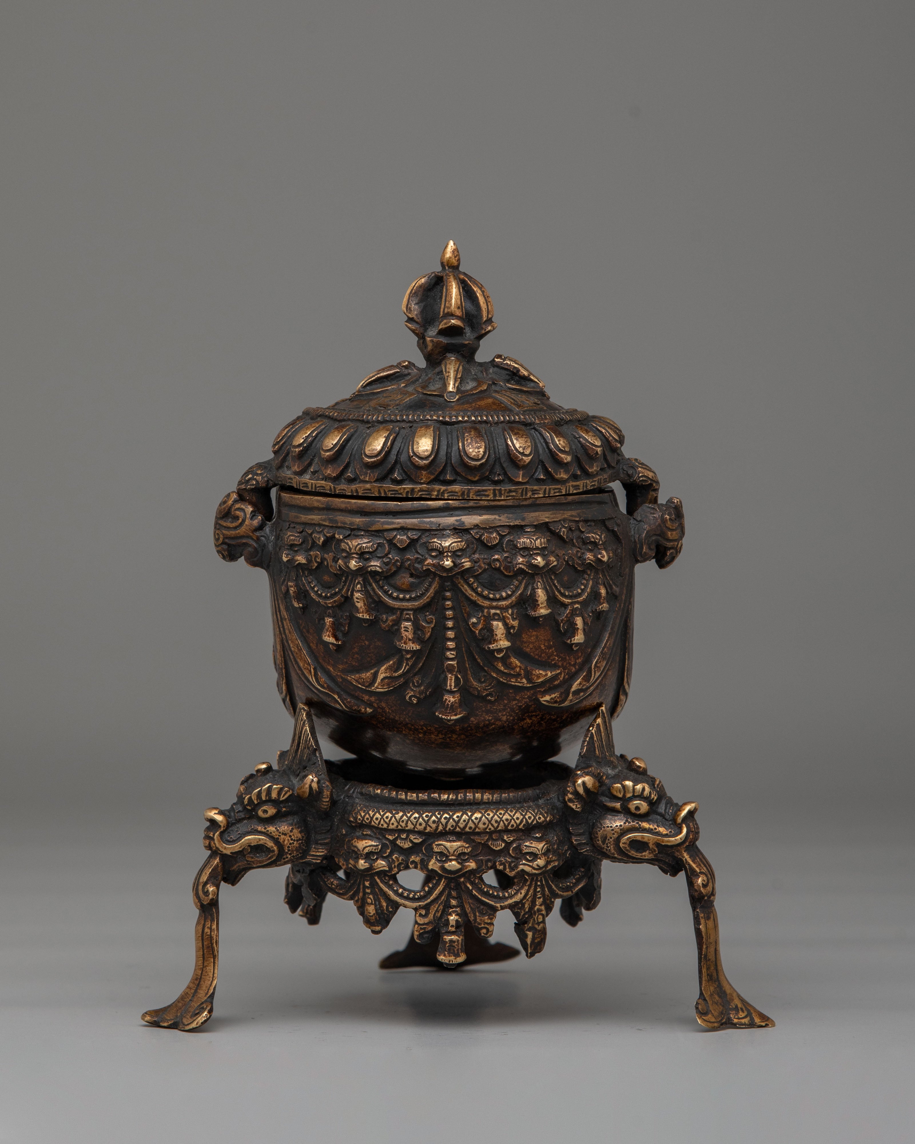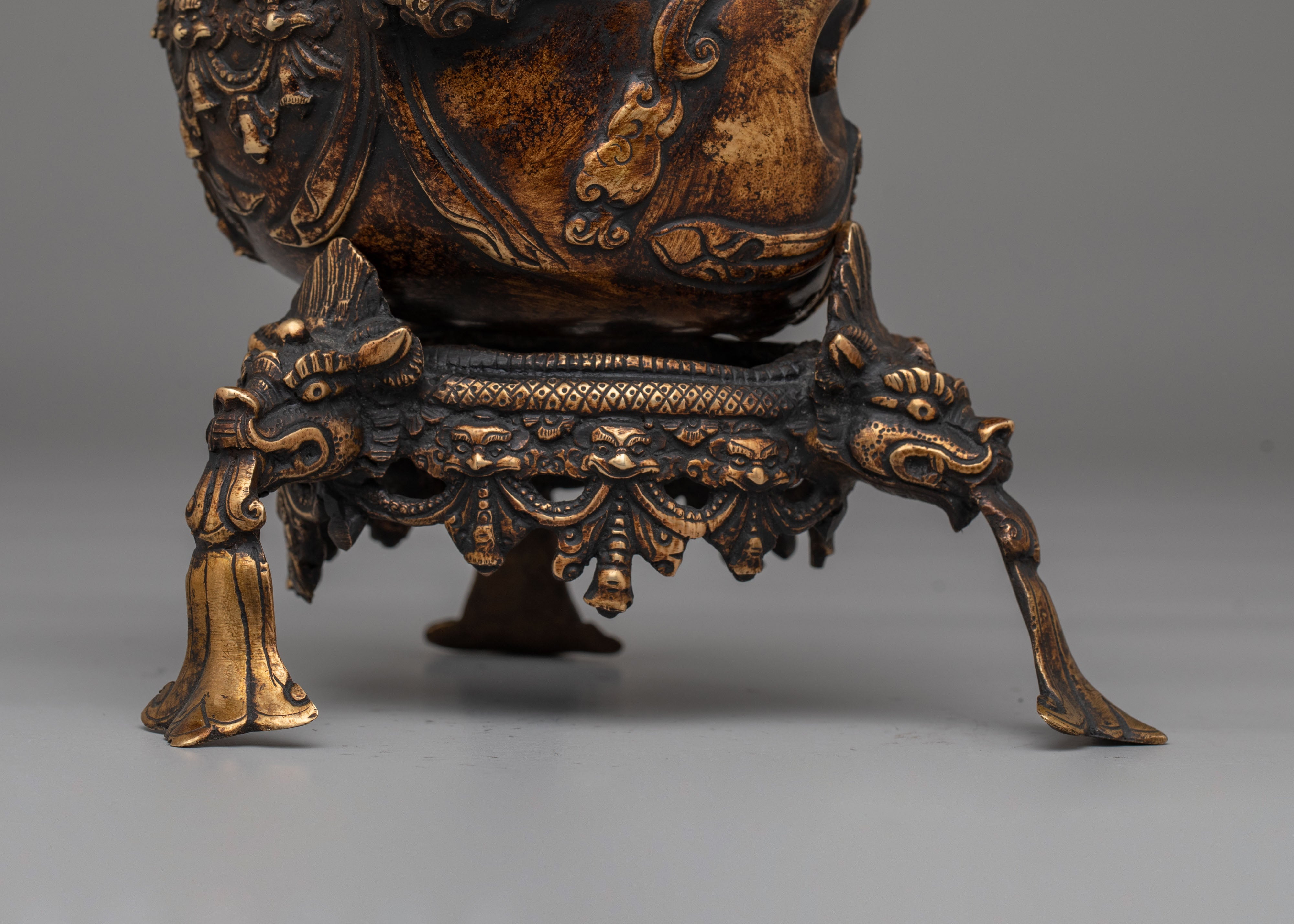 The copper body of the Kapala is adorned with ornate motifs, including decorative handles and a majestic lid that signify strength and protection. The antique finish enhances the ritualistic qualities of the Kapala, making it not only a functional tool but also a piece of art. This handcrafted vessel embodies the rich spiritual traditions of Tibetan Buddhism and serves as a reminder of the purification process during rituals, where offerings are made to invoke blessings, wisdom, and divine protection.