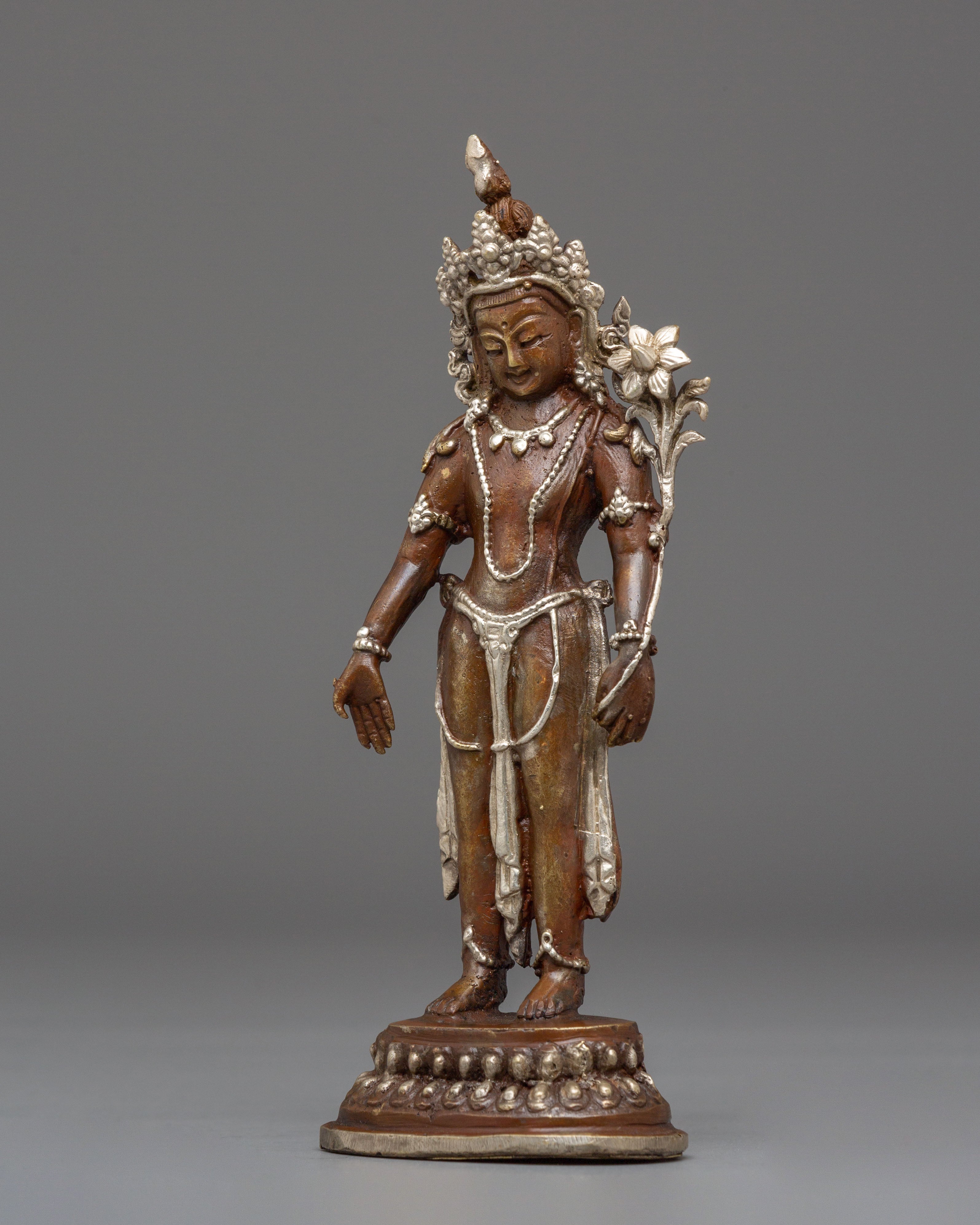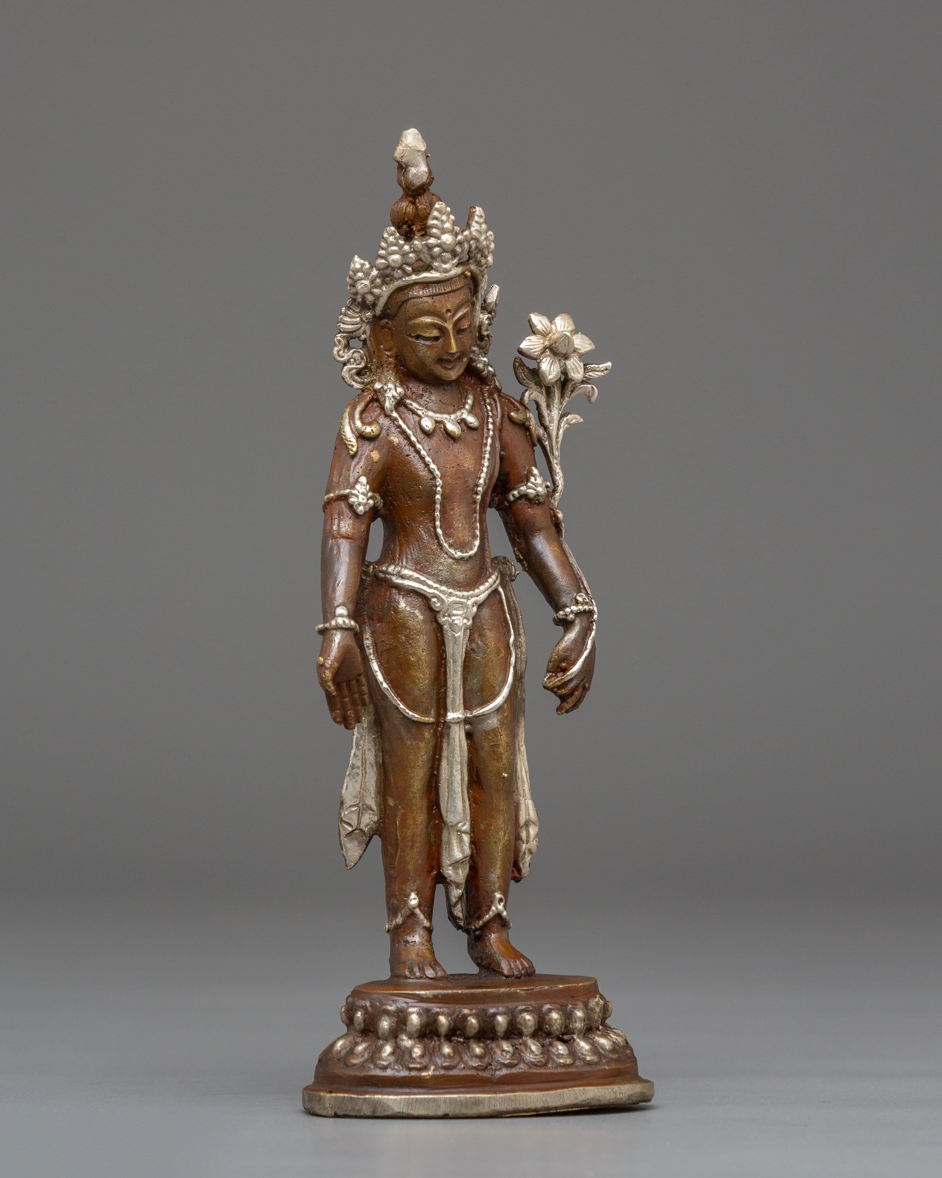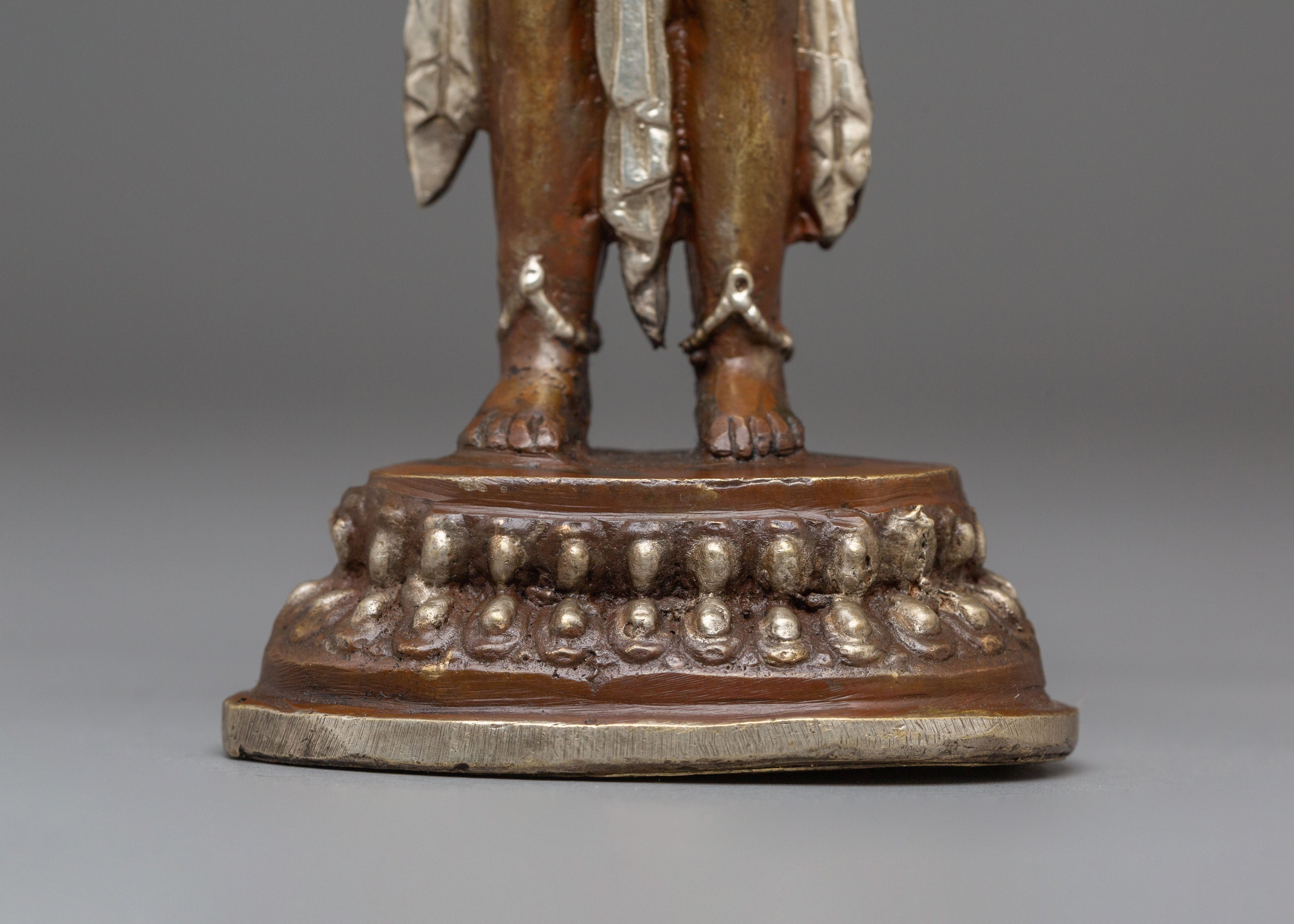 The oxidized copper body of the statue gives it a timeless, ancient look, while the silver plating provides a modern touch of refinement. Lokeshwor's gentle and peaceful demeanor is captured with exquisite artistry, evoking a sense of tranquility and spiritual protection. This statue invites positive energy and compassion into your home, enhancing your meditation or prayer space with its divine presence. Display it on your altar or in your living room to invite blessings of peace, wisdom, and protection from this compassionate deity.